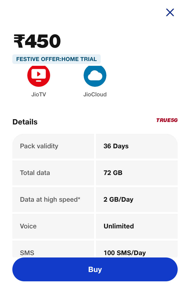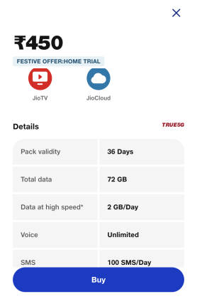 36 दिन की वैलिडिटी वाले Jio ₹450 प्लान में मिलने वाले बेनिफिट्स पर नजर डालें तो कंपनी इसमें हर दिन 2जीबी 5जी डाटा दे रही है। यह अनलिमिट इंटरनेट डाटा है जो Jio 5G नेटवर्क पर काम करेगा। दरअसल इन दिनों रिलायंस जियो के हर 2जीबी डेली डाटा वाले प्लान में कंपनी unlimited 5G data बेनिफिट्स दे रही है। इसी का लाभ 450 रुपये वाले जियो के प्रीपेड प्लान में भी मिलेगा।