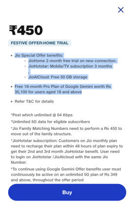 इसके साथ ही जियो नंबर पर 450 रुपये वाले प्लान से रिचार्ज कराने वाले ग्राहकों को कंपनी JioAICloud के लिए 50GB स्टोरेज मुफ्त देगी। सिर्फ इतना ही नहीं जियो कस्टमर को Reliance Jio द्वारा 18 महीने का Google Gemini Pro प्लान भी फ्री में दिया जाएगा। बताते चलें कि अगर यही गूगल जैमिनी प्रो प्लान अलग से खरीदा जाता है तो इसकी कॉस्ट 35 हजार रुपये के करीब पड़ती है। लेकिन जियो कस्टमर्स को यह फ्री मिलेगा।