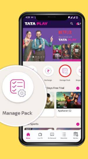 स्टेप #4: यहां पर अगली स्क्रीन पर आपको ‘माय टाटा प्ले’और ‘मैनेज पैक’ का विकल्प दिखाई देगा।