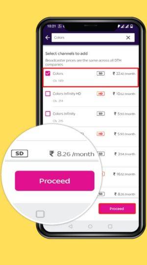 स्टेप #7: आप जिस चैनल को जोड़ना चाहते हैं उसकी कैटेगरी पर टैप करें, फिर अगली स्क्रीन पर चैनल लिस्ट दिखाई देगा। फिर जिस चैनल को जोड़ना चाहते हैं उसके लिए चेक बॉक्स पर टिक करें और स्क्रीन के नीचे ‘Proceed’ विकल्प पर टैप करें।