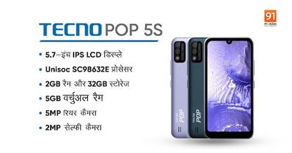 Tecno ने अपने बजट स्मार्टफोन सीरीज POP का नया फोन Tecno POP 5S को लॉन्च कर दिया है। कंपनी अब तक इस स्मार्टफोन सीरीज के तीन फोन – Tecno POP 5, POP 5 Pro, और POP 5X को लॉन्च कर चुकी है। Tecno POP 5S स्मार्टफोन को कंपनी ने मैक्सिको में लॉन्च किया है। टेक्नो के लेटेस्ट स्मार्टफ़ोन Tecno POP 5S के स्पेसिफिकेशन्स की बात करें तो यह बजट स्मार्टफोन 5.7-इंच के HD+ डिस्प्ले के साथ पेश किया गया है। यह स्मार्टफोन Unisoc प्रोसेसर के साथ पेश किया गया है। Tecno के इस फोन में 5MP का रियर कैमरा, 3,020mAh की बैटरी दी गी है। यहां हम आपको टेक्नो के लेटेस्ट स्मार्टफोन की सभी स्पेसिफिकेशन्स और कीमत के बारे में डिटेल में बता रहे हैं।