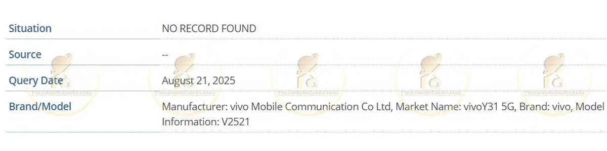 वीवो वाई31 5जी फोन की ताजा जानकारी हमें टेक वेबसाइट पेश्नेटगीक्ज़ के माध्यम से प्राप्त हुई है। रिपोर्ट में बताया गया है कि यह अपकमिंग वीवो 5जी फोन आईएमईआई डाटाबेस पर लिस्ट हो गया है। यहां मोबाइल को V2521 मॉडल नंबर के साथ लिस्ट किया गया है जिसके साथ फोन का नाम Vivo Y31 5G बता दिया गया है। मोबाइल का मार्केटिंग नेम जहां डाटाबेस में सामने आ चुका है, वहीं अब कंपनी द्वारा इसे अनाउंस किए जाने का इंतजार किया जा रहा है।
