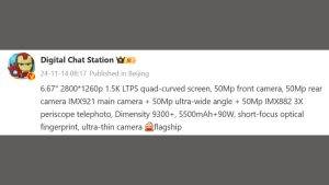 टिप्स्टर ने फोन का नाम लिए बताया है कि वीवो के आगामी फोन में कैसे स्पेसिफिकेशंस मिलेंगे। इसे वीवो एस20 प्रो माना जा रहा है।