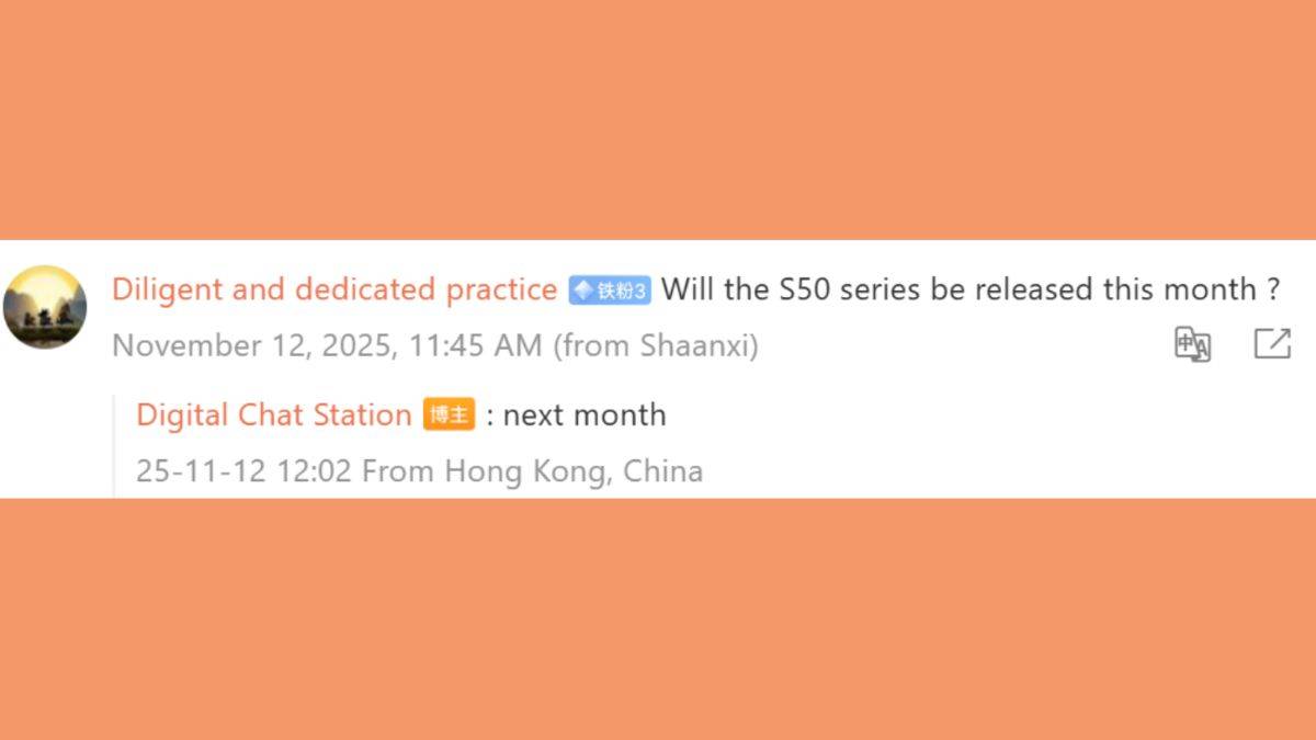 दरअसल टिप्सटर डिजिटल चैट स्टेशन (DCS) ने पहले बताया था कि Vivo अपनी नई S50 सीरीज को इस महीने लॉन्च कर सकता है। वहीं, नई रिपोर्ट में दावा किया गया है कि Vivo S50 सीरीज दिसंबर में चीन में लॉन्च हो सकती है। इस सीरीज में दो मॉडल Vivo S50 और Vivo S50 Pro Mini शामिल हो सकते हैं।