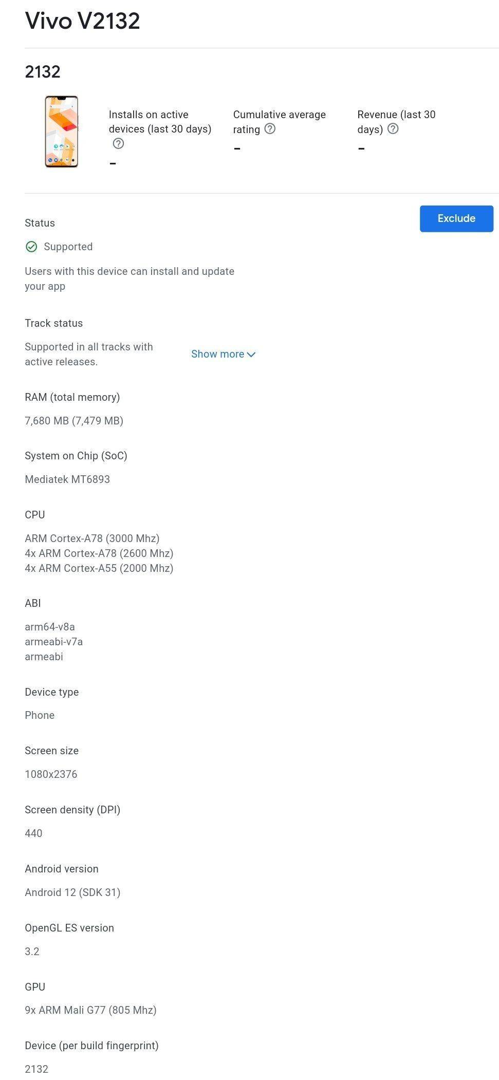 Google Play Console की लिस्टिंग के मुताबिक, Vivo V23 Pro (V2132) स्मार्टफोन की डिस्प्ले का रेजलूशन 1080 × 2376 पिक्सल हो सकता है। इसके साथ ही अपकमिंग V23 Pro स्मार्टफोन Android 12 पर आधारित FuntouchOS 12 पर रन करेगा। इसके साथ ही वीवो का यह फोन मीडियाटेक के Dimensity 1200 प्रोसेसर और 8GB रैम के साथ पेश किया जाएगा।