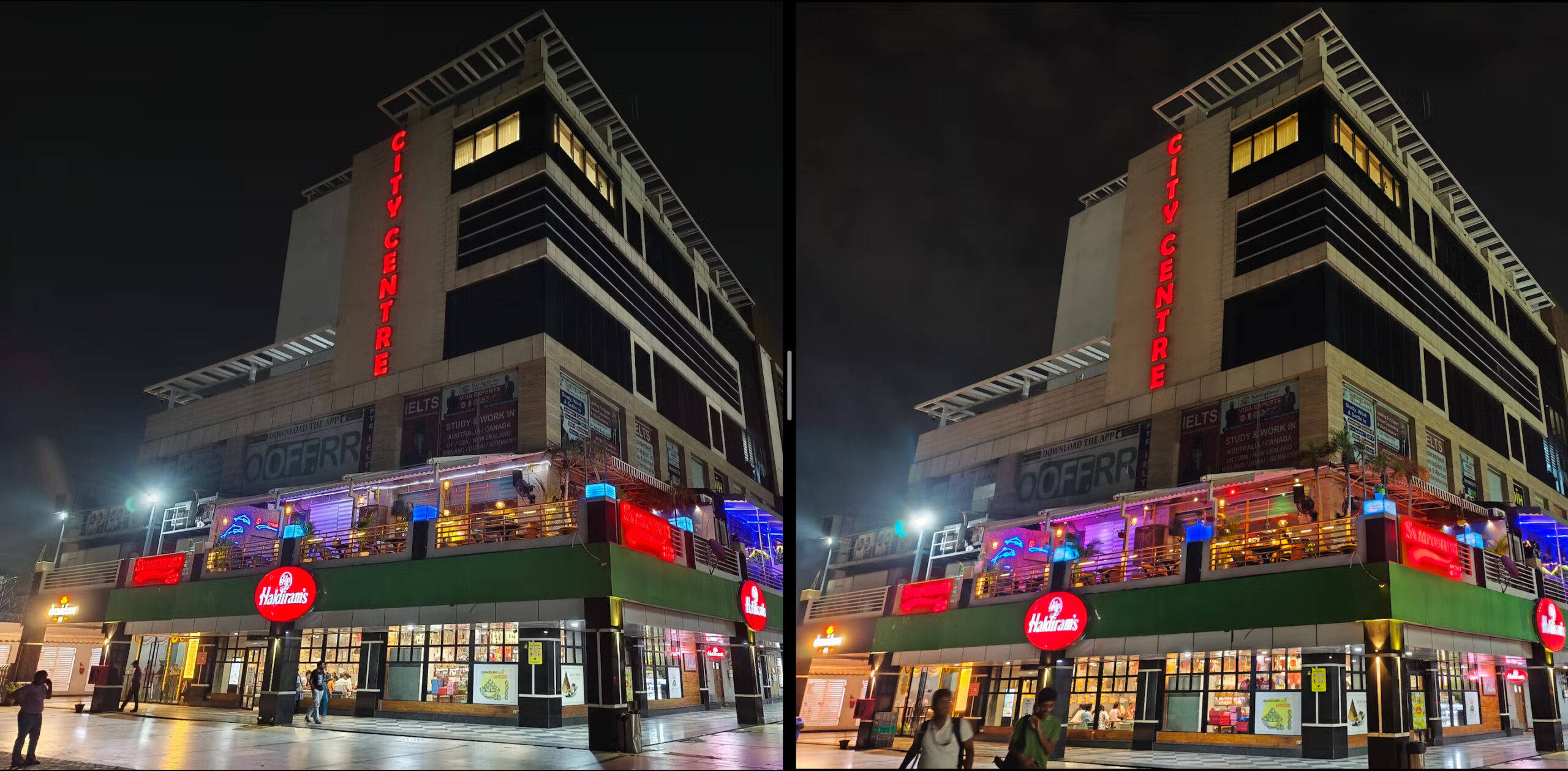 रात में खींची गई फोटोज़ में दोेनों ही स्मार्टफोंस ने कलरफुल लाइट्स को सेचुरेट किया है। शाओमी 14 सीवी में ये रंग ज्यादा डिस्टॉर्ट हो रहे हैं। वहीं अगर बिल्डिंग पर लगे पोस्टर्स पर ध्यान दें तो यहां भी Xiaomi 14 Civi फोन से खींची गई फोटोज़ में ये उतने क्लियर नहीं है जितने कि Vivo V40 Pro में साफ पढ़ने में आ रहे हैं।