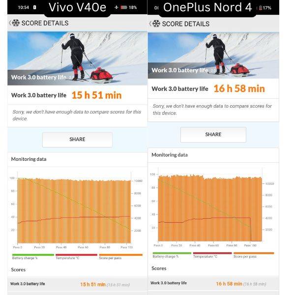 PCMark बैटरी टेस्ट में OnePlus Nord 4 व Vivo V40e से एक घंटा ज्यादा चलता है, जो तब तक लगातार काम करता है जब तक बैटरी 100 प्रतिशत से घटकर 20 प्रतिशत न हो जाए। दोनों स्मार्टफोन का टेस्ट ब्राइटनेस को 80 प्रतिशत और वॉल्यूम को 50 प्रतिशत पर सेट करके किया गया है। हालाँकि, OnePlus Nord 4 इस टेस्ट में ज्यादा स्क्रीन टाइम हासिल करता है, जो रियल टाइम में इस्तेमाल में बेहतर बैटरी बैकअप का सुझाव देता है।