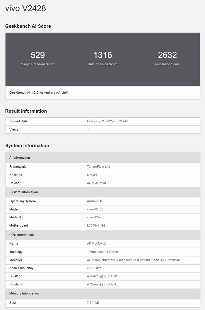 - यह Geekbench AI database में स्पॉट हुआ है जहां इसका मॉडल vivo V2428 बताया गया है।