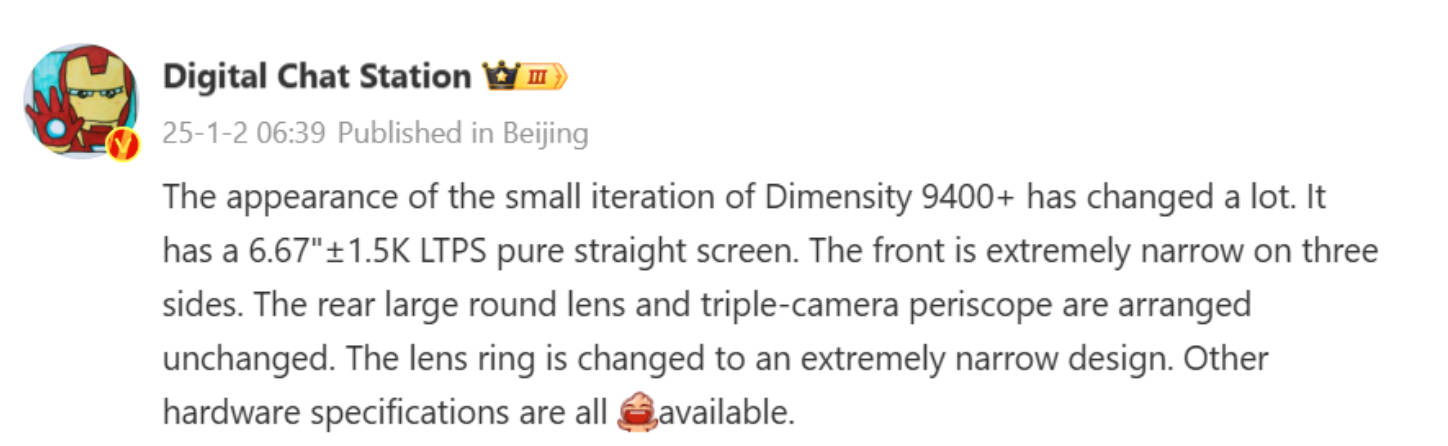 - कथित तौर पर स्मार्टफोन MediaTek Dimensity 9400 Plus प्रोसेसर द्वारा संचालित होगा। यह Dimensity 9400 का थोड़ा अपग्रेडेड वर्जन होने की उम्मीद है और अगले कुछ महीनों में इसकी घोषणा की जाएगी।