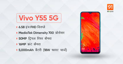 Vivo Y55 5G स्मार्टफोन को मीडियाटेक के Dimensity 700 चिपसेट के साथ पेश किया गया है। वीवो का यह स्मार्टफोन Android 11 पर आधारित कस्टम स्किन Funtouch OS 12 पर रन करता है। बैटरी की बात करें तो इस फ़ोन में 5000mAh की बैटरी दी गई हैं। वीवो के इस फोन में 18W का फास्ट चार्ज सपोर्ट करता है। यह भी पढ़ें : Samsung Galaxy M33 5G स्मार्टफोन का भारत में प्रॉडक्शन शुरू, जल्द होगा लॉन्च