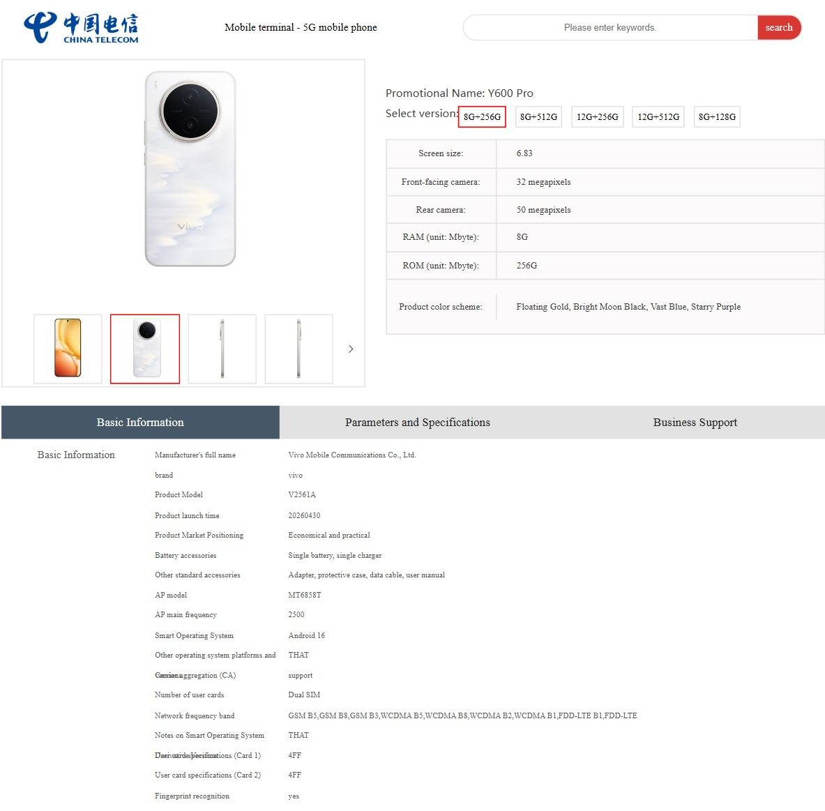 Vivo ने अपने नए स्मार्टफोन Vivo Y600 Pro को कुछ दिन पहले ही टीज किया है। वहीं, अब इसकी पूरी डिटेल लॉन्च से पहले ही सामने आ गई है। यह फोन कंपनी के सबसे बड़े बैटरी वाले स्मार्टफोंस में से एक हो सकता है। दरअसल, यह डिवाइस China Telecom की लिस्टिंग, Geekbench और 3C सर्टिफिकेशन प्लेटफॉर्म पर नजर आया है जिससे इसके लगभग सभी स्पेसिफिकेशंस पता चल गए हैं। रिपोर्ट के मुताबिक यह स्मार्टफोन 30 अप्रैल को चीन में लॉन्च किया जा सकता है। आइए, आगे डिटेल्स जानते हैं।
