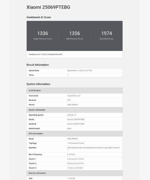 Xiaomi 15T स्मार्टफोन की गीकबेंच लिस्टिंग सामने आई है। इस लिस्टिंग से फोन के प्रोसेसर, रैम और परफॉर्मेंस स्कोर की जानकारी मिली है। कुछ दिन पहले इसका प्रो वर्जन Xiaomi 15T Pro भी गीकबेंच पर नजर आया था, जिसमें MediaTek Dimensity 9400+ चिपसेट होने की जानकारी दी गई थी। वहीं, अब टिपस्टर अभिषेक यादव ने सोशल मीडिया प्लेटफॉर्म एक्स पर Xiaomi 15T को लेकर जानकारी शेयर की है, जिसके मुताबिक, रेगुलर Xiaomi 15T में अलग प्रोसेसर का इस्तेमाल किया गया है। मॉडल नंबर 25069PTEBG के साथ यह फोन गीकबेंच AI पर लिस्ट हुआ बै, जहां इसने सिंगल-प्रिसीजन टेस्ट में 1,336 पॉइंट, हाफ-प्रिसीजन टेस्ट में 1,356 पॉइंट और क्वांटाइज्ड बेंचमार्क में 1,974 पॉइंट हासिल किए। ये स्कोर साफ बताते हैं कि फोन का परफॉर्मेंस बढ़िया रहने वाला है।
