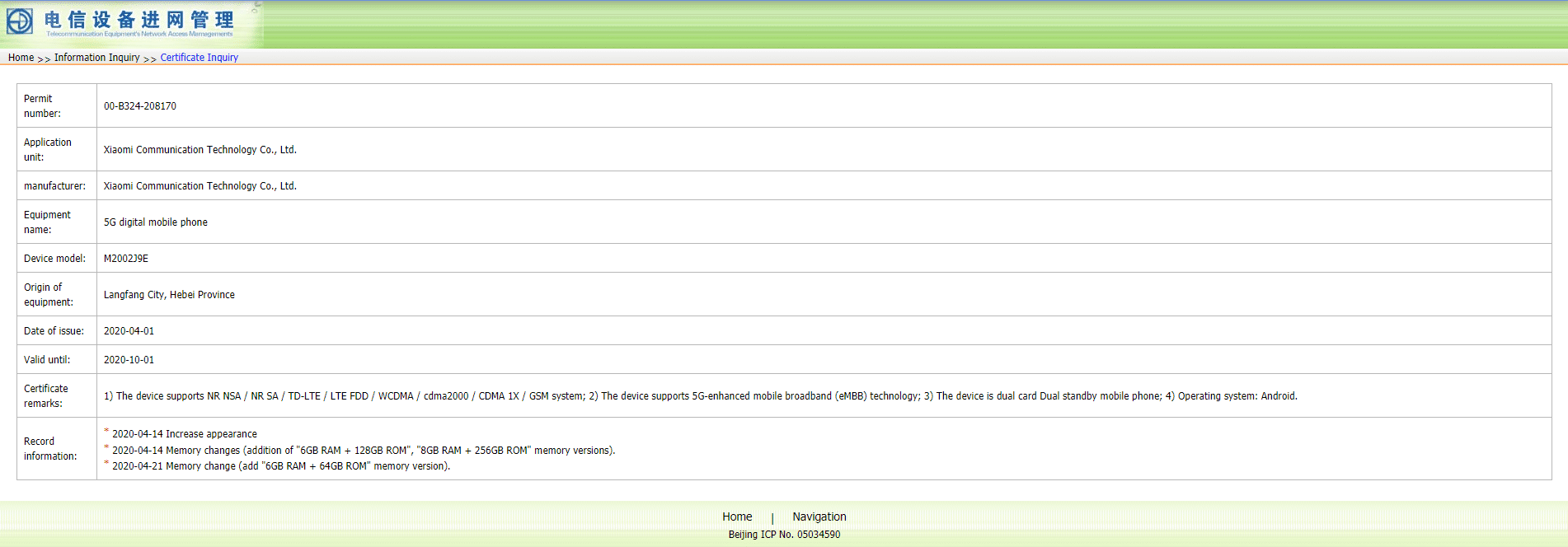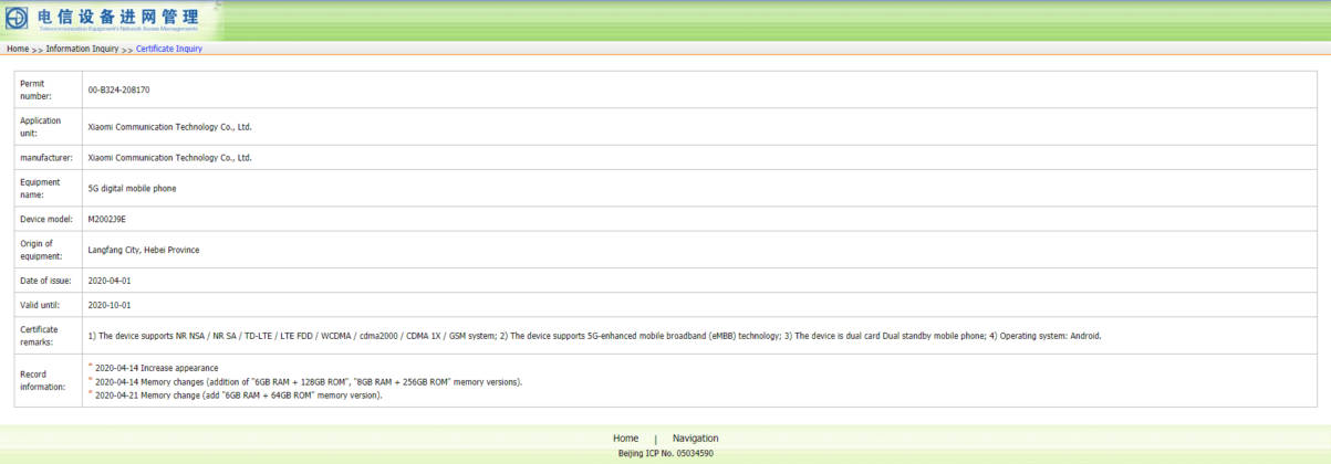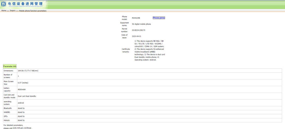 सर्टिफिकेशन साइट टेना पर इस फोन को स्पॉट किया गया है। टेना पर फोन की की स्पेसिफिकेशन्स सामने आई हैं। TENAA सर्टिफिकेशन के अनुसार डिवाइस मॉडल नंबर M2002J9E के साथ स्पॉट किया गया है जो कि Mi 10 Youth Edition 5G है।