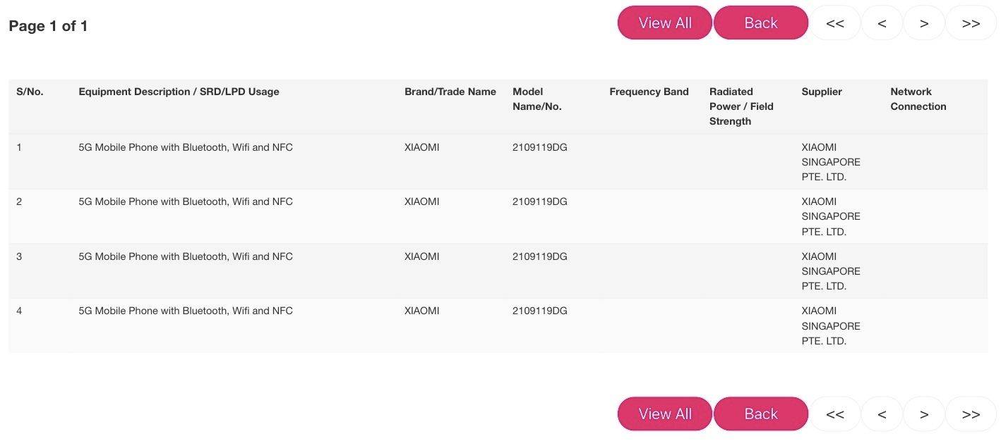 इस डिवाइस का मॉडल नंबर – 2109119DG होगा जो कि इन्फोकॉम मीडिया डेवलपमेंट अथॉरिटी (IMDA), सिंगापुर की वेबसाइट पर भी दिखाई दिया था। इस मॉडल को पहले ही भारतीय मानक ब्यूरो (बीआईएस) से सर्टिफिकेशन मिल चुका है। वहीं, “2109” मॉडल नंबर इस ओर इशारा कर रहा है कि यह डिवाइस सितंबर में भारत में पेश किया जा सकता है। इसे भी पढ़ें: Xiaomi Mi Mix 4 होगा कर्व स्क्रीन और अंडर डिस्प्ले कैमरा वाला पहला स्मार्टफोन