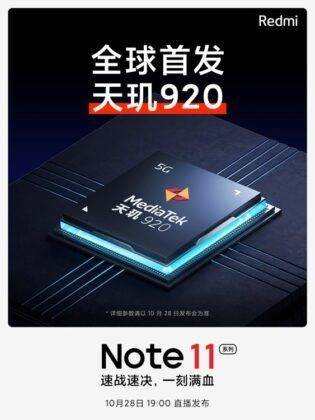 Xiaomi Redmi Note 11 series के लॉन्च में अब एक दिन का वक्त बचा है। शाओमी होम मार्केट चीन में 28 अक्टूबर को अपनी पॉपुलर Redmi Note 11 सीरीज के स्मार्टफोन को लॉन्च करेगी। अटकले लगाई जा रही है कि कंपनी इस सीरीज के तीन स्मार्टफोन Redmi Note 11, Redmi Note 11 Pro, और Redmi Note 11 Pro+ को लॉन्च करेगी। लॉन्च से पहले Redmi Note 11 series के कई स्पेसिफिकेशन्स और फ़ीचर्स को कंपनी टीज कर चुकी है। अब शाओमी ने लॉन्च से ठीक एक दिन पहले कंफर्म किया है कि अपकमिंग Redmi Note 11 Pro स्मार्टफोन को MediaTek Dimensity 920 प्रोसेसर के साथ मार्केट में पेश किया जाएगा।