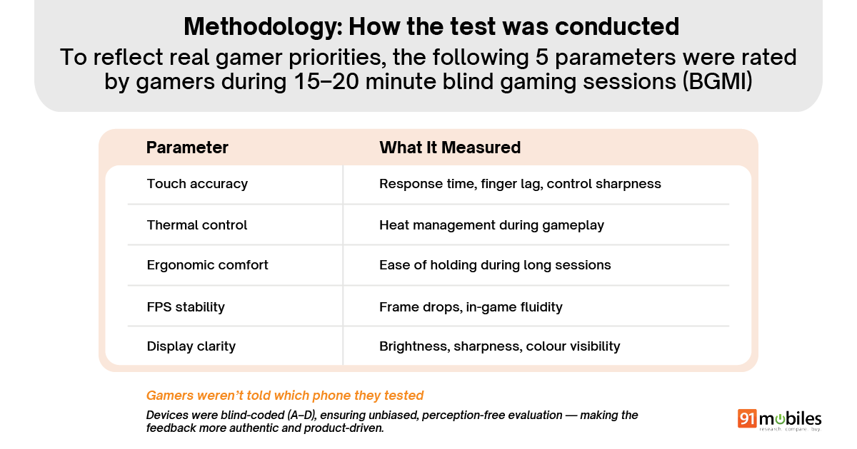 The gamers played BGMI on each phone for at least 15 minutes to evaluate the gaming experience fairly. And the idea was to eliminate brand perception entirely to see which phone delivered the best gaming experience when there are no logos or preconceived notions.