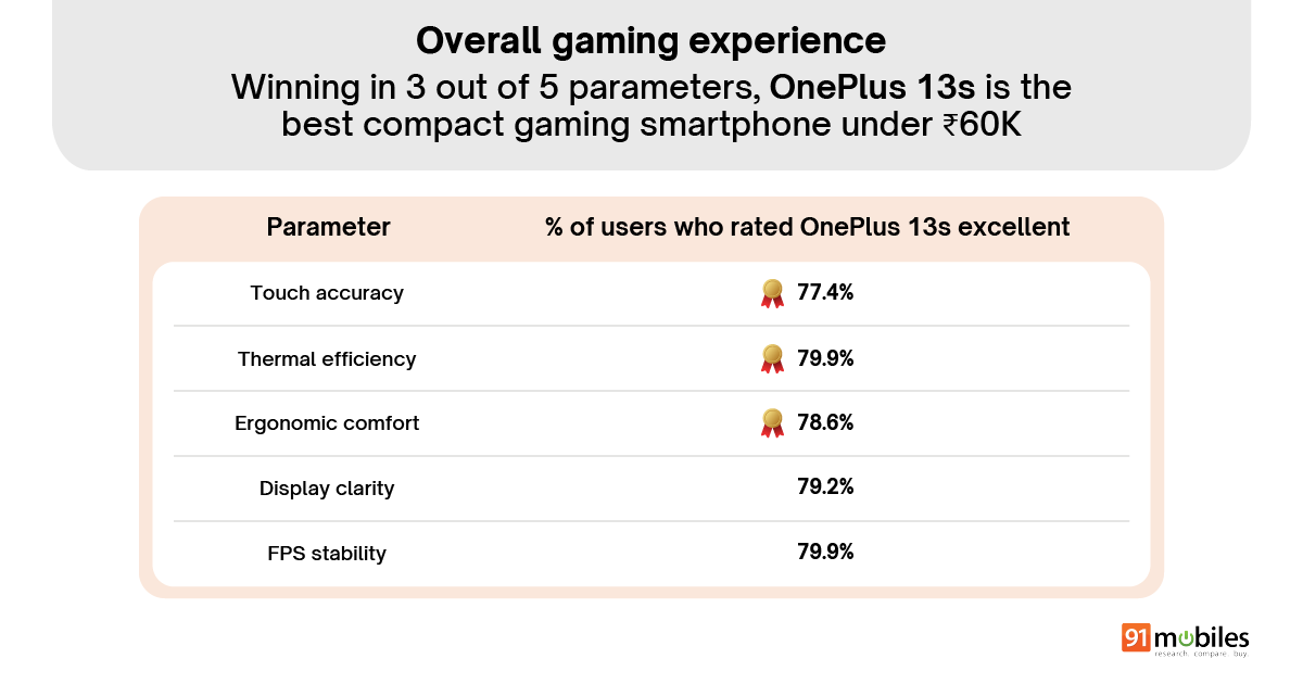 Gamers rated the OnePlus 13s highest across three of the five parameters: touch accuracy, thermal efficiency, and ergonomic comfort. Nearly 80% of participants also gave it top marks for FPS stability and display clarity, highlighting just how well-rounded the experience was.