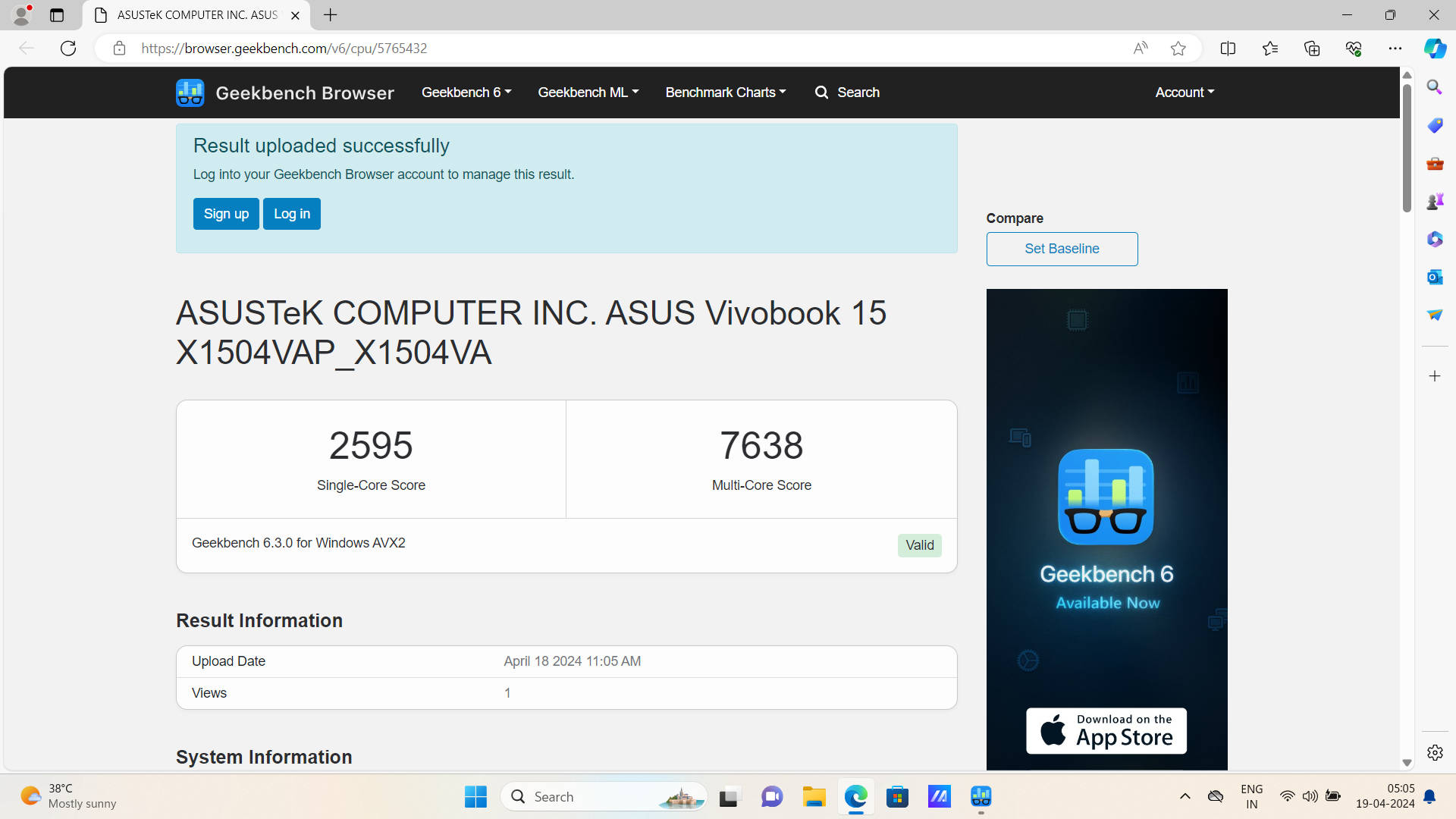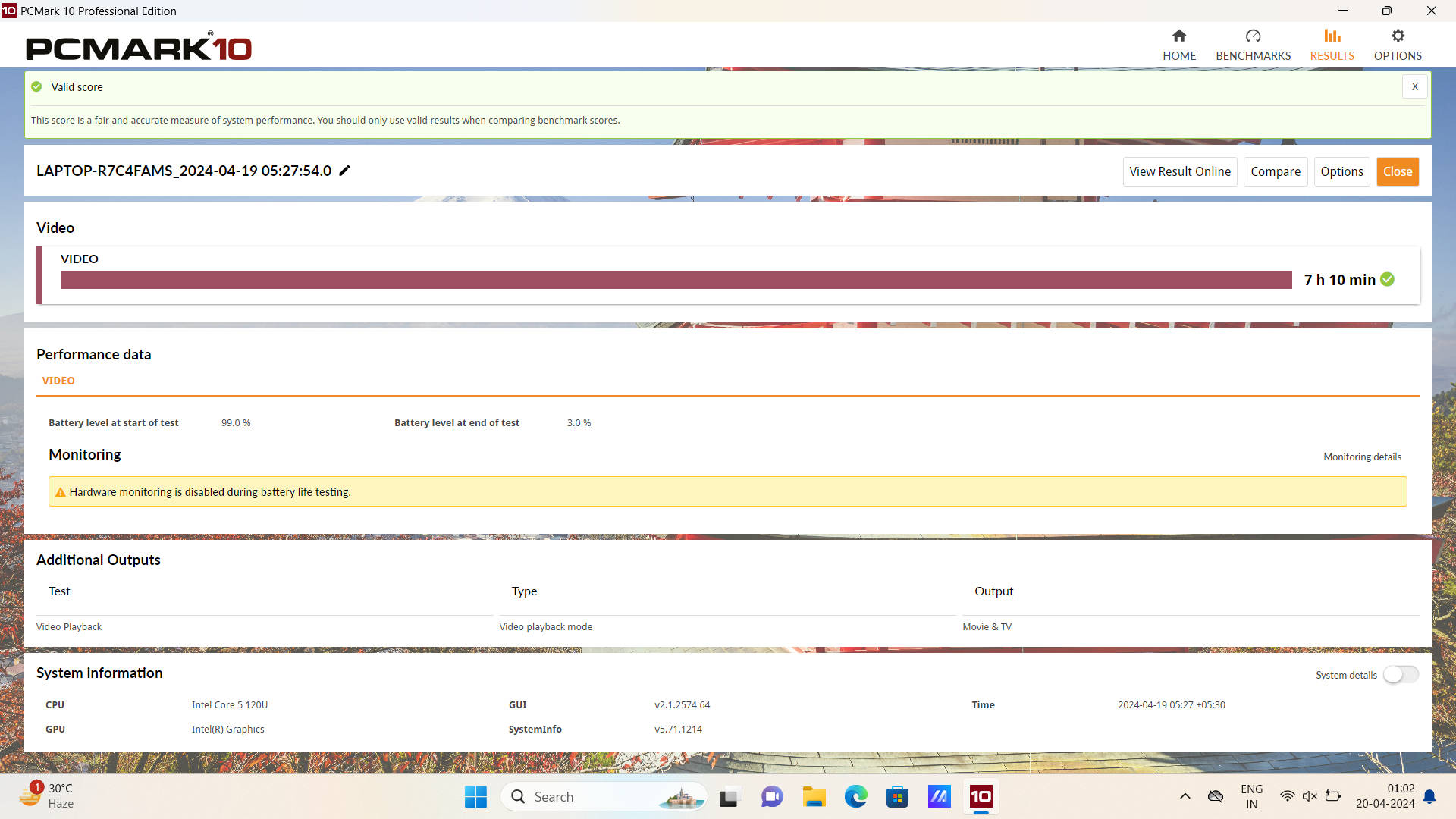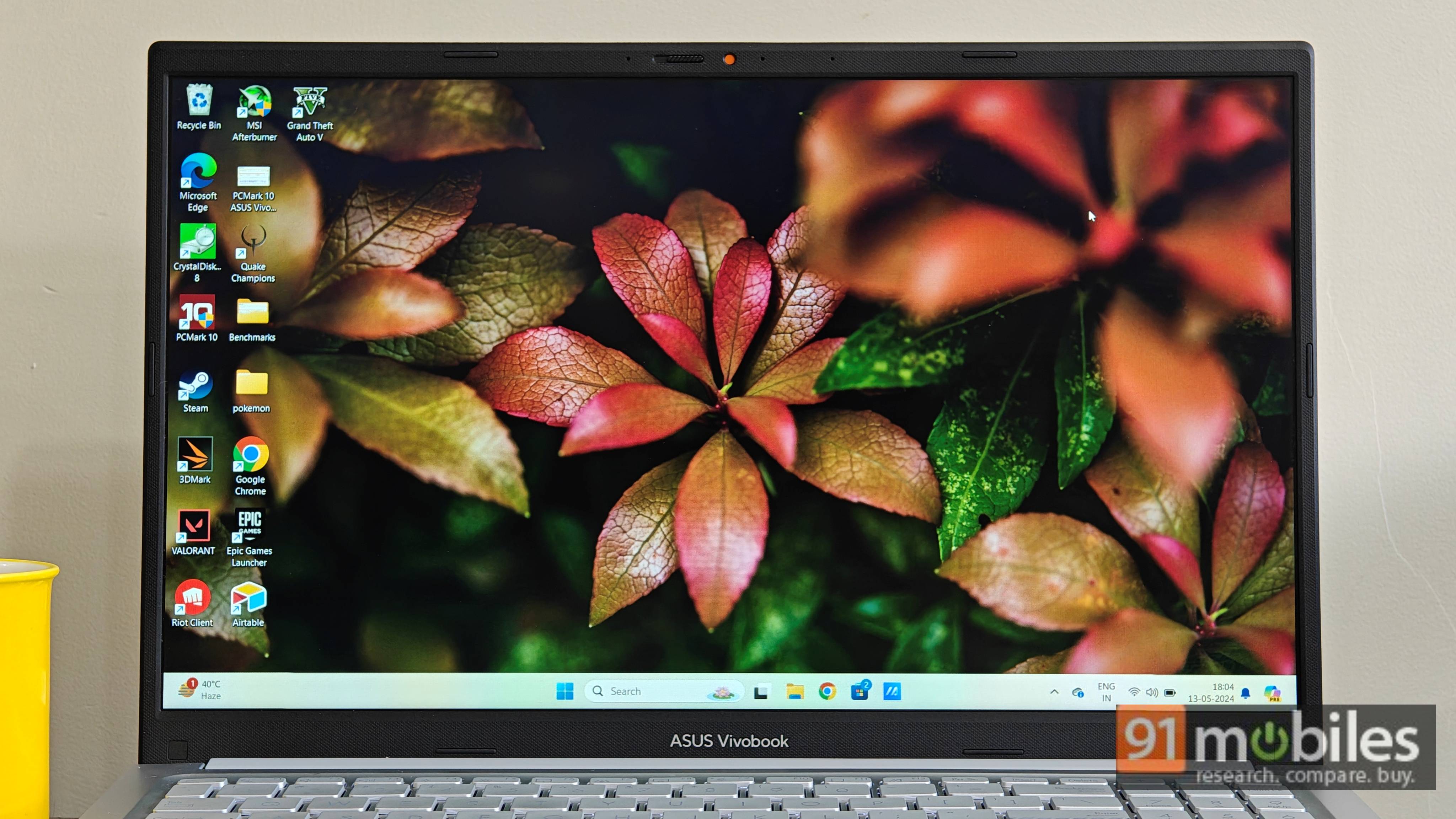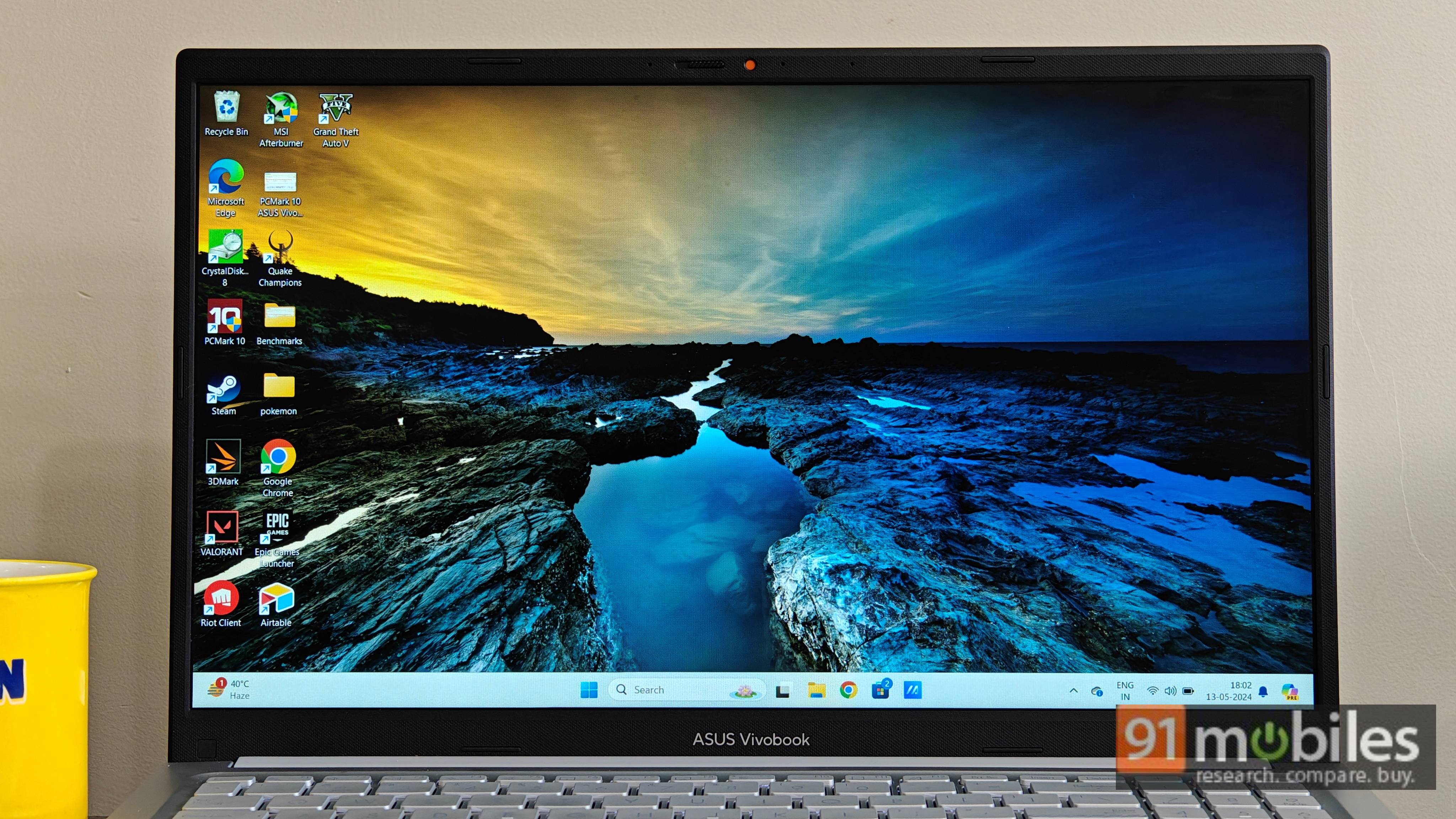 GTA V, for instance, averages around 28FPS on the laptop at 1080p resolution and High settings. You must play the game at low-medium graphics settings to get playable FPS. Similarly, Valorant netted 80FPS on the laptop. As for the battery backup, I could get about 5.5-6 hours of work out of the Vivobook 15 in one sitting. PCMark 10’s Battery Video loop test painted a similar picture, with the laptop shutting down after seven hours.