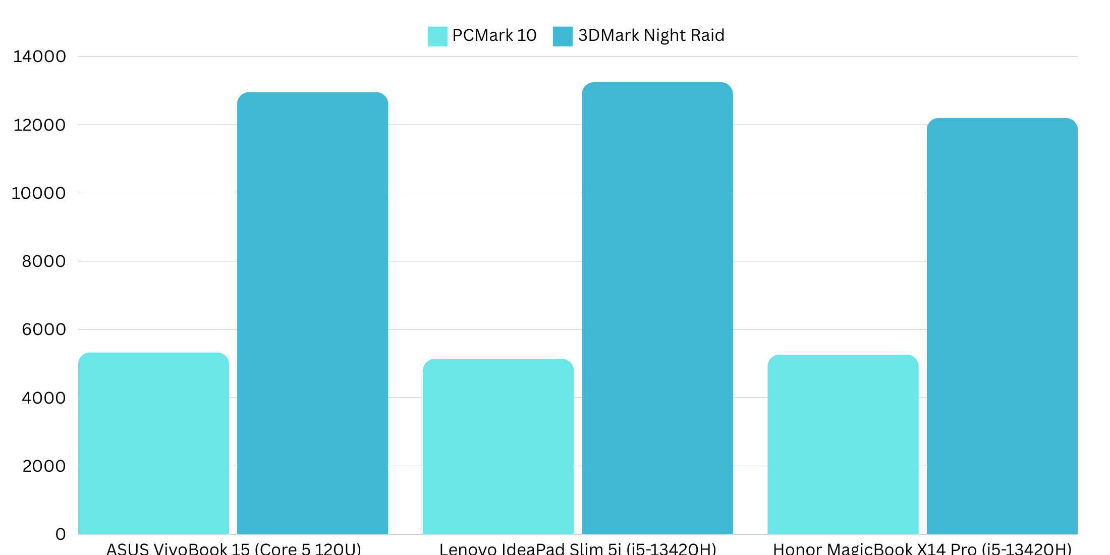 I did run some benchmarks to give you a better glimpse at the laptop’s performance chops. Starting with PCMark 10 and PCMark 10 Extended tests, the laptop logged 5,328 and 4,643 points, respectively. In CineBench, the Vivobook 15 netted 421 and 103 points in the multi-core and single-core test runs. In addition, the laptop benched 12,958 points in 3DMark’s Night Raid test, which, by the way, gauges the performance of a laptop’s integrated GPU. The results put the laptop squarely against devices like the HonorBook X14 and the Lenovo IdeaPad Slim 5i, both of which are powered by Intel’s 13th Gen Core i5-13420H processor.