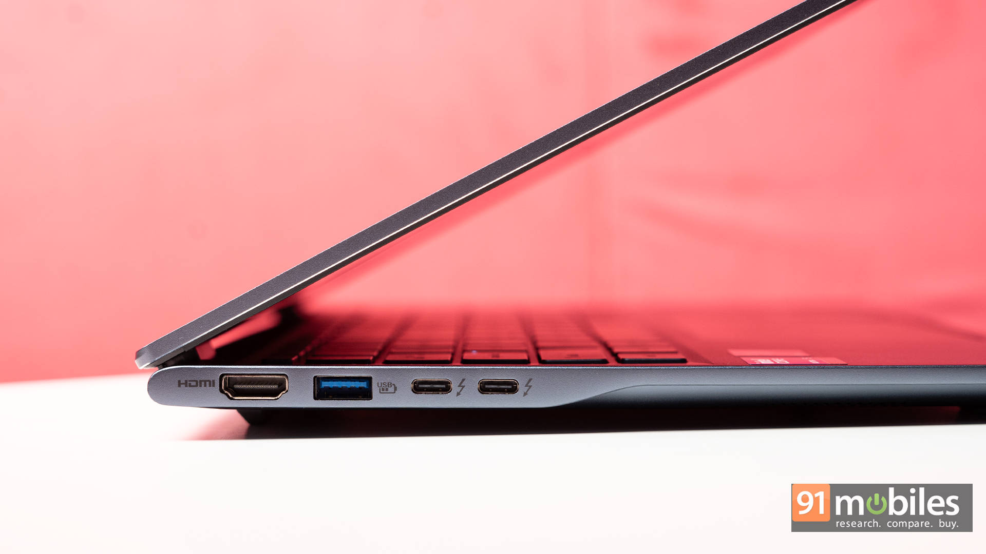 In terms of connectivity, the laptop comes with a good number of ports despite its slim form factor. On the left, there’s a full-sized HDMI 2.1 port, a USB-A 3.2 port, and dual Thunderbolt 4 ports. Both the Thunderbolt 4 ports support USB4, DisplayPort output, and power delivery.