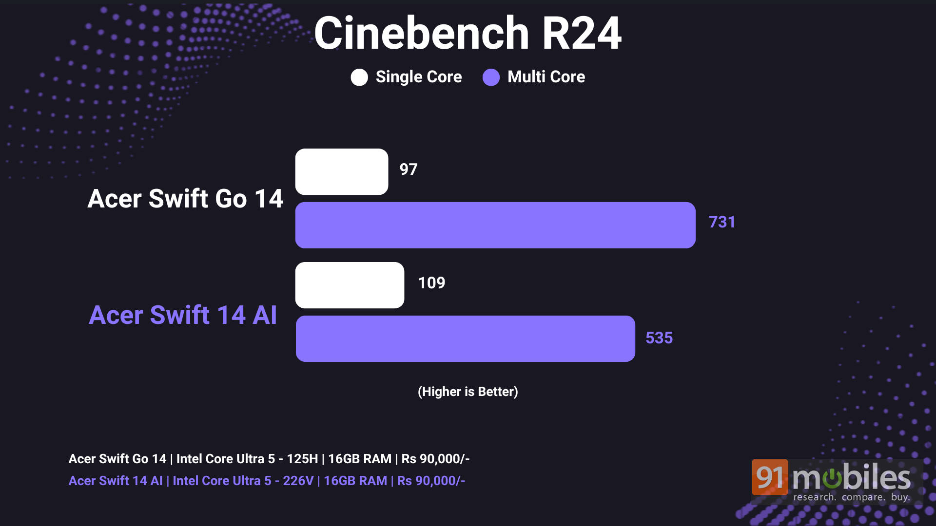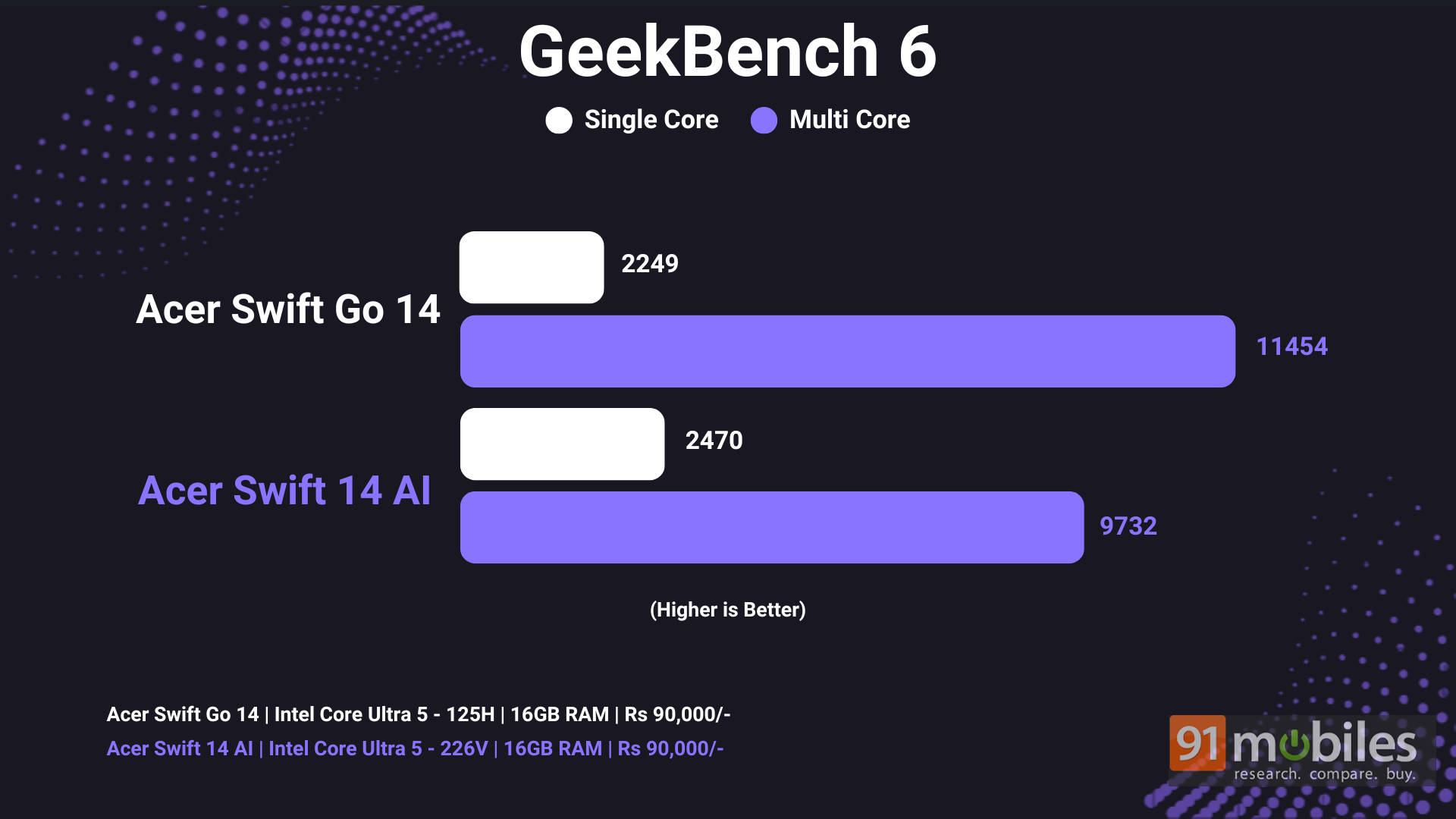 Of course, everything looks great in isolation. So, I decided to compare it with the Acer Swift Go 14, powered by the older Intel Core Ultra 5 125H processor. Side by side, the difference is noticeable, but unfortunately, it’s the other way around. Sure, the 226V does have the edge in single-core performance, but in multi-core benchmarks, the 125H still holds a sizeable lead. This is primarily down to the lower core count on the 226V, so there’s that.