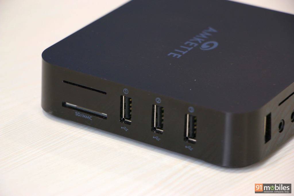 The front of the device has an LED indicating its status, while the right side sports three USB 2.0 ports and an SD card slot. The rear of the Amkette EvoTV is chock-a-block with a number of ports including another USB port, SPDIF and AV jacks, a full-size HDMI port, an Ethernet port and a power socket. There are a few air vents on the sides, whereas the left side is completely barren.