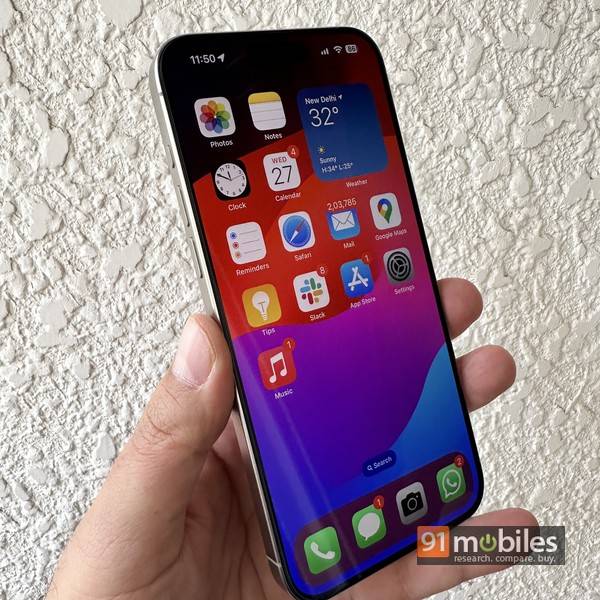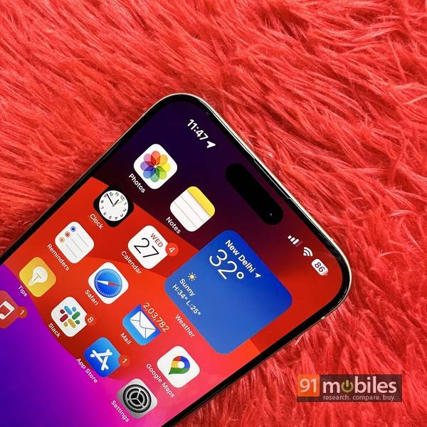 On the display side of things, on offer is the expectedly gorgeous 6.7-inch Super Retina XDR OLED screen, offering 2,796 x 1,290 pixel resolution, up to 120Hz refresh rate, HDR support, True Tone, Always-On Display (AoD), and a peak brightness of a whopping 2000 nits outdoors. It’s a beautiful, fluid display that makes everything from text to graphics, photos, videos, games, etc come alive and pop on the screen, all sharp and vivid. And just like last year, the expanse of the display is broken by the pill-shaped Dynamic Island, with the front camera placed towards its side.