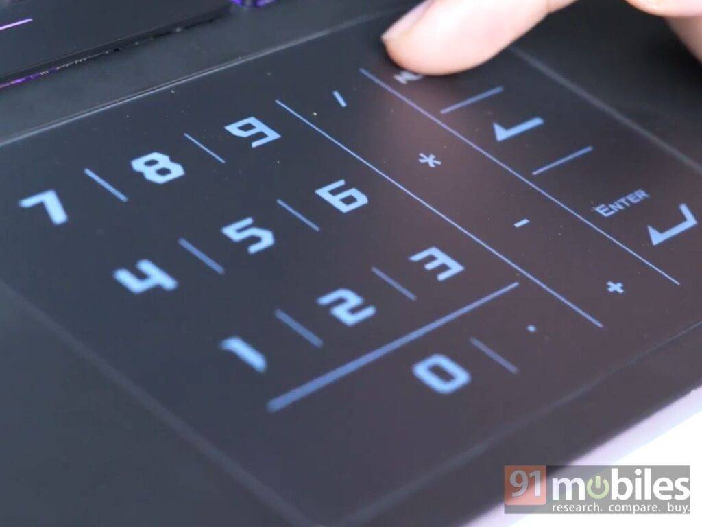 The laptop is unapologetically designed for gamers, with its RGB accents on the display logo, the RGB keyboard and the RGB band that surrounds the edges. The design certainly looks very appealing and has a funky vibe to it, but is largely unchanged compared to the previous iterations. There are smaller ROG logos and a smaller “Republic of Gamers” text on the back panel. The keypad area is also semi-transparent, which adds a unique touch.
