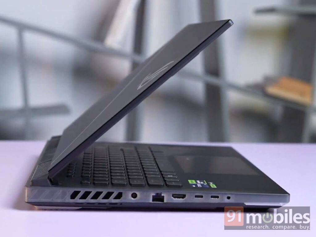 The machine features big exhaust vents on its sides and a wide exhaust vent on the back, positioning all the I/O ports on the sides of the laptop. These exhausts are designed to efficiently cool down the powerful hardware packed within the device, and they do look quite nice. For connectivity, you get two USB 3.2 Gen 2 Type-A ports on the right edge, an RJ-45 Ethernet port, dual USB-C ports, an HDMI 2.1 output, and a 3.5mm combo audio jack on the left. One of the two USB-C ports is a Thunderbolt 4 output, while the other one is a USB 3.2 Gen 2 Type-C port, and both support DisplayPort output along with G-Sync compatibility for external monitors.