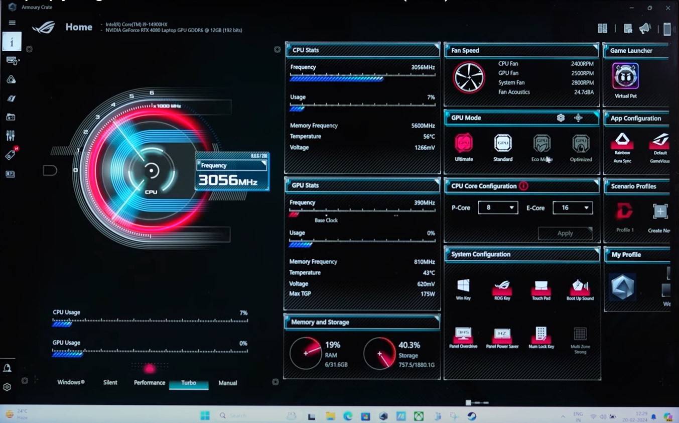 The laptop comes preloaded with Windows 11, which is standard nowadays. The real highlight, however, is the Armoury Crate app, which allows you to fine-tune your usage down to the smallest details. With the app, you have constant access to your CPU and GPU temperatures, fan speeds, GPU modes for optimisation, and a lot of other features. You can also select and customise performance profiles to suit your preferences, and you can even adjust the display response time as you see fit.