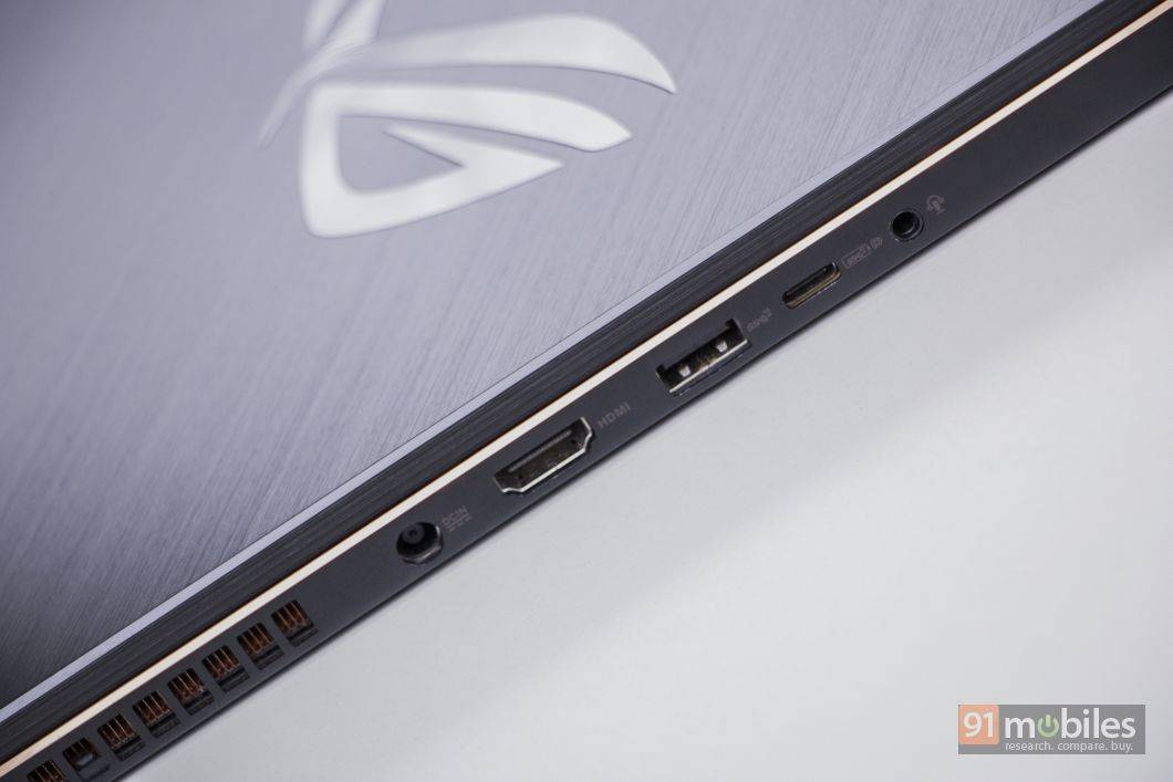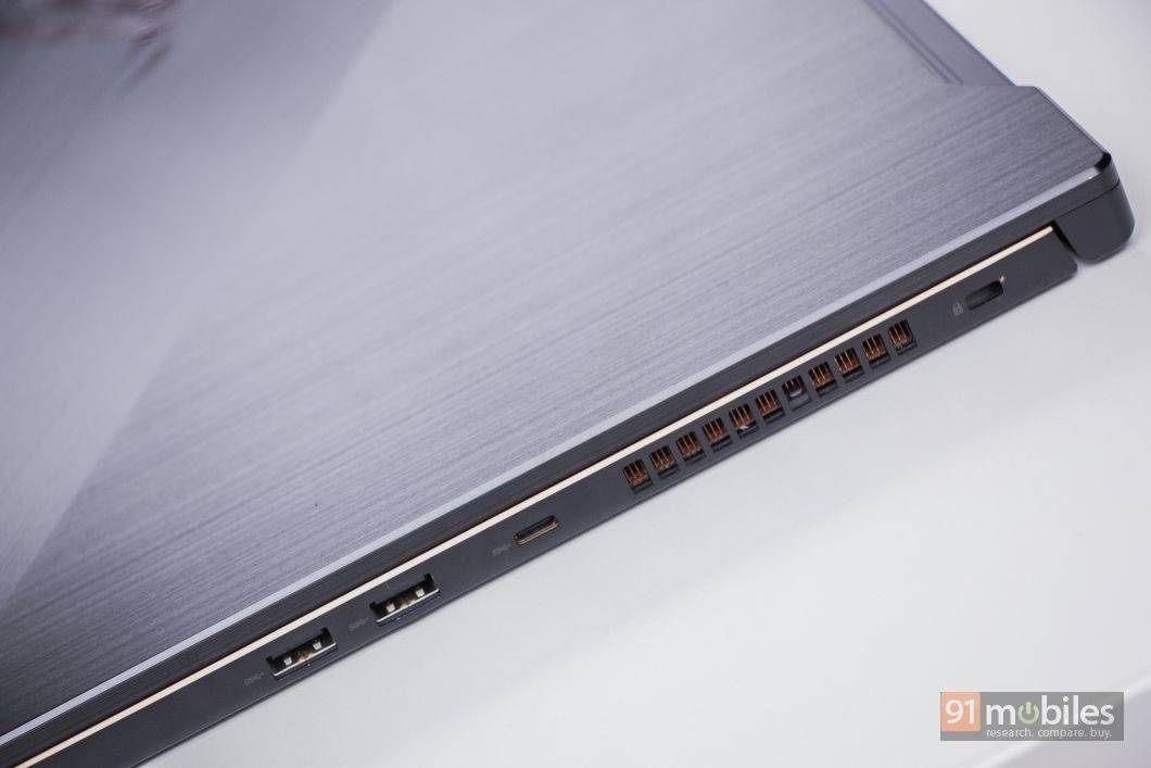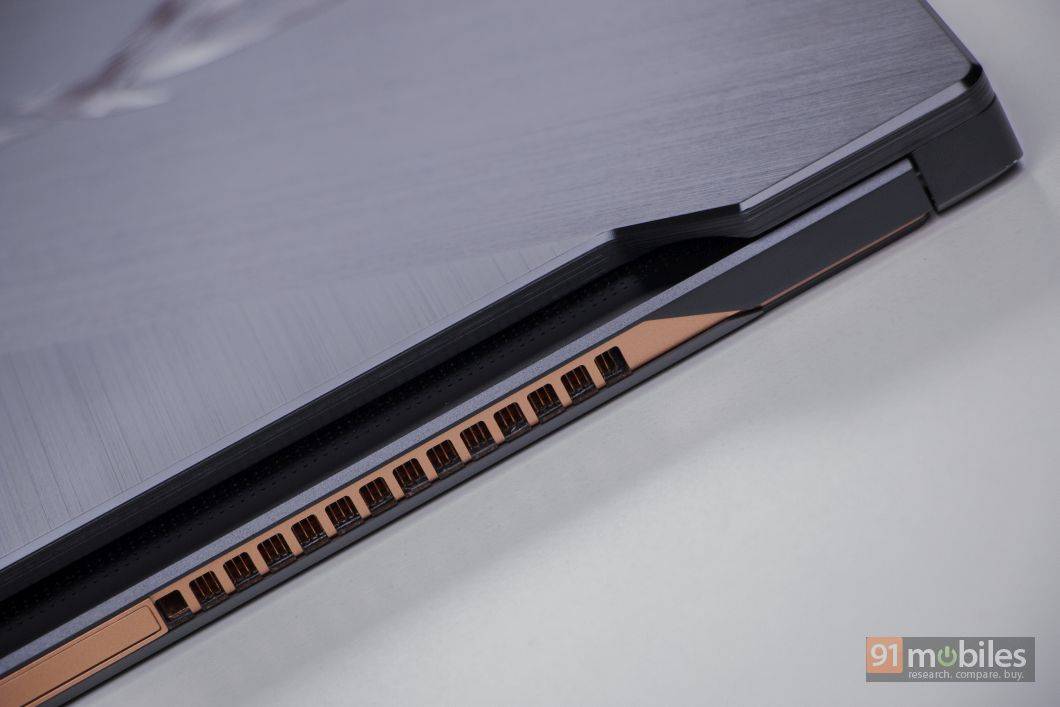 With large size comes an assortment of ports, and the ROG Zephyrus S GX701GX is quite loaded in this department. You get the proprietary barrel-type charging socket on the left, along with a full-size HDMI port, a USB Type-A port, a Type-C port and a 3.5mm audio interface. Towards the right, you’ll find another Type-C socket, and two Type-A ports. What’s conspicuously missing though is an SD card reader, which is odd considering the machine does have an ample space to offer the same.
