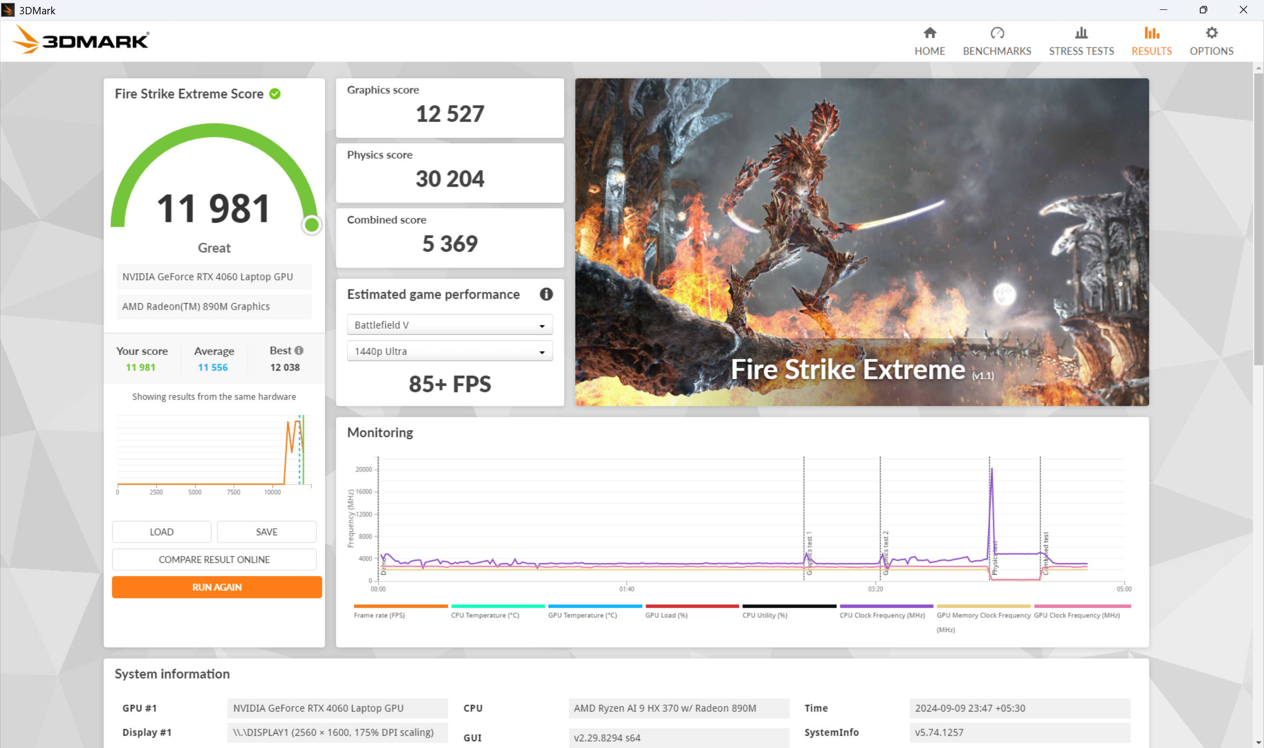 As for the RTX 4060, it delivers respectable performance despite being packed in a thin and light chassis. In GTA V, I was getting an average of 135FPS with very high settings at 1600p and close to 144Hz at 1200p. Forza Horizon 5 runs close to 80FPS at 1600p, and 100FPS average at 1200p with the Extreme preset, along with DLSS disabled and ray tracing on high. Cyberpunk 2077 is one of the most demanding games today and I was getting acceptably smooth 62FPS at 1600p and 82FPS at 1200p. This was testing at the Ray Tracing Ultra preset with ray reconstruction and DLSS frame generation enabled.