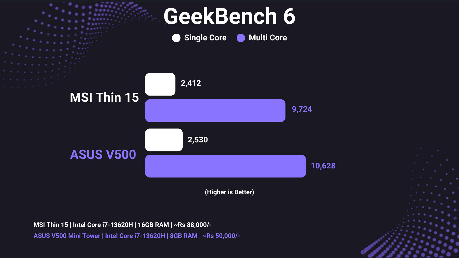The ASUS V500 Mini Tower feels like a laptop in cosplay: dressed as a desktop, but pulling off the role pretty well. It might sound odd at first, but it works better than you’d expect. With plenty of cooling and space to stretch out, that humble CPU actually gets to shine. It runs quiet, performs well, and feels like a proper, well-built machine. For what it sets out to do, it’s a surprisingly solid package. In terms of pricing, the i3-1315U variant costs Rs. 35K, while the i5-13420H variant comes at Rs. 48K. Lastly, the i7-13620H variant that I’ve tested here, comes bundled with Microsoft Office 2024, and fetches a price tag of Rs. 65K.