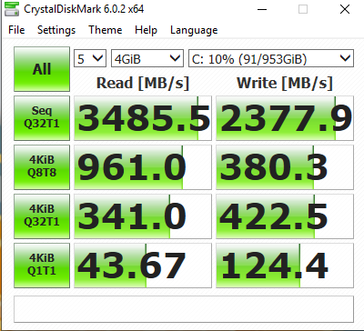 Storage-wise, the ASUS ZenBook Edition 30 ships with 1TB SSD. The solid-state disk is quite fast, which is also reflected on CrystalDiskMark scores, where it achieved 3,485.5MB/s read and 2,377.9MB/s speeds.