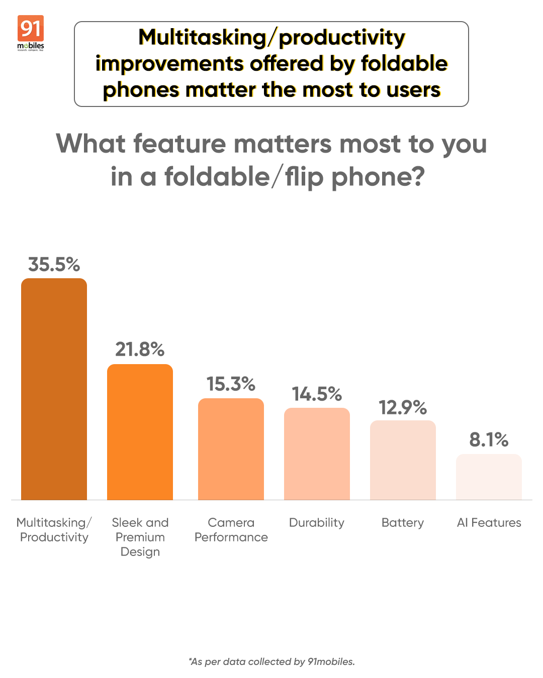 When our Tech Tribe members were asked what matters most in a foldable device, multitasking and productivity features topped the list at 35.5 percent. This was followed by design, camera performance, and durability. The Fold7, with its taskbar, improved app continuity between inner and outer screens, and AI-powered multitasking tools, seems well-aligned with what users want.