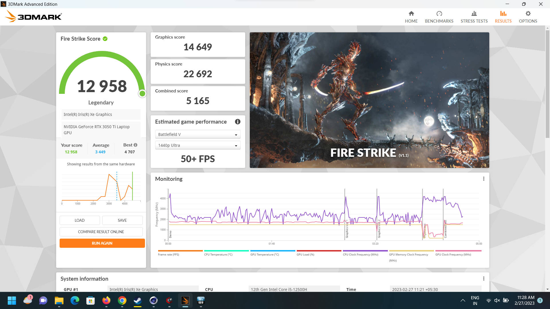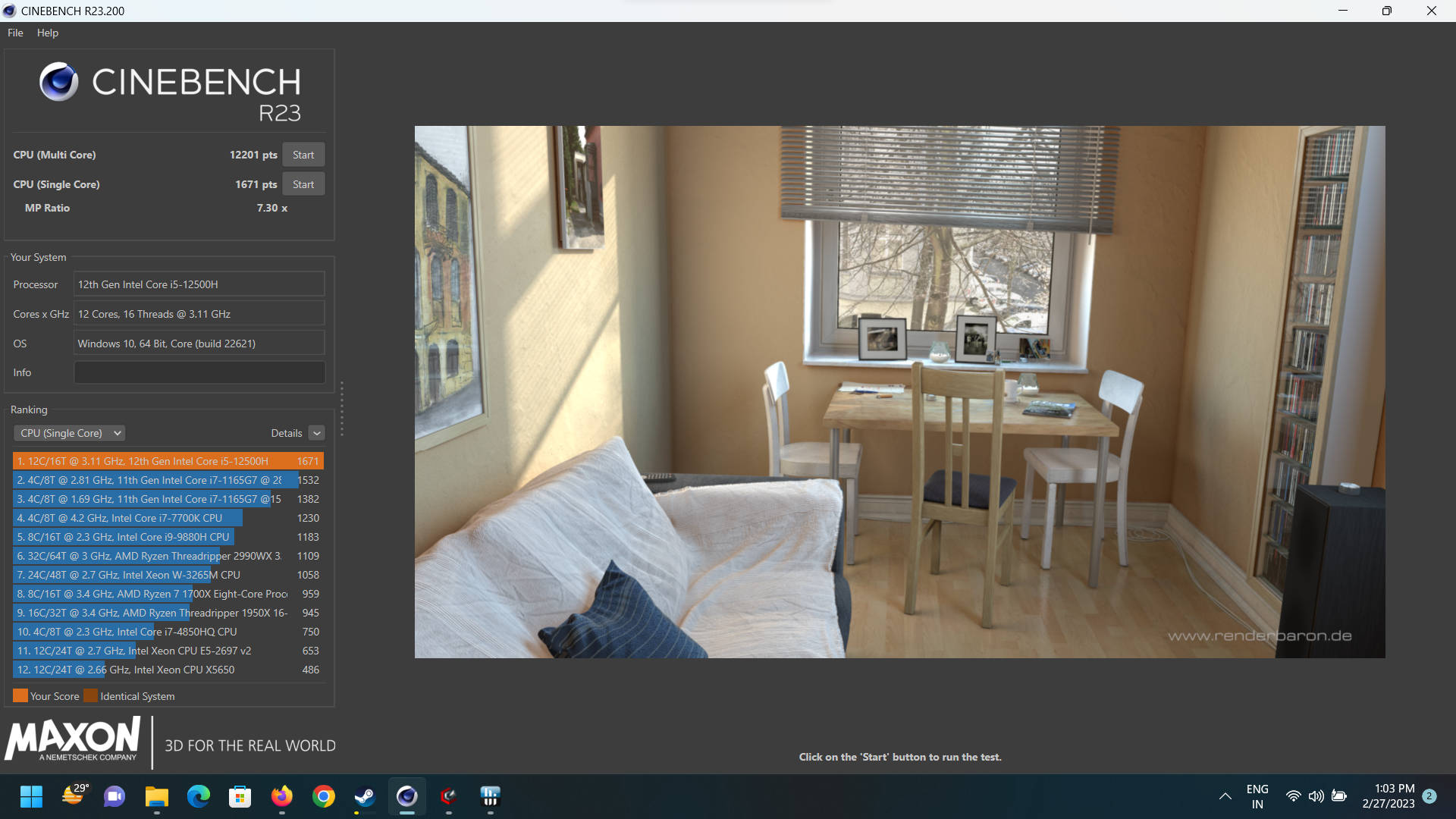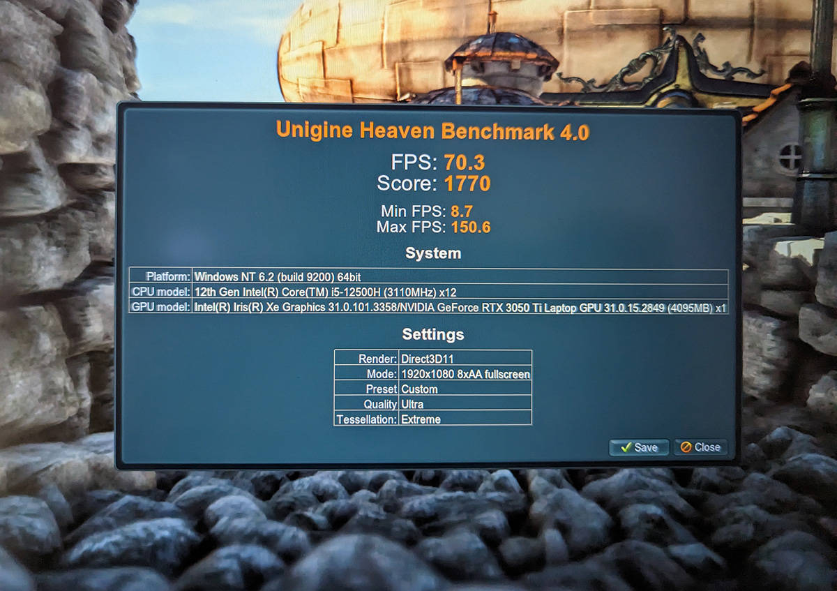 Performance is actually pretty solid on this machine. The Core i5-12500H managed to score very close to its faster sibling, the Core i7-12700H in Cinebench R23 single and multi-core benchmarks. It has been tuned to draw up to 70W of power, or at least what HWInfo suggested. During most of the benchmark testing, the CPU would peak at 70W and eventually drop down and stay around the 62W mark. Similarly, the P-cores would peak at 4.5GHz, but settle down to 3.2GHz while the E-cores would go up to 3.3GHz and sustain at 2.5GHz.
