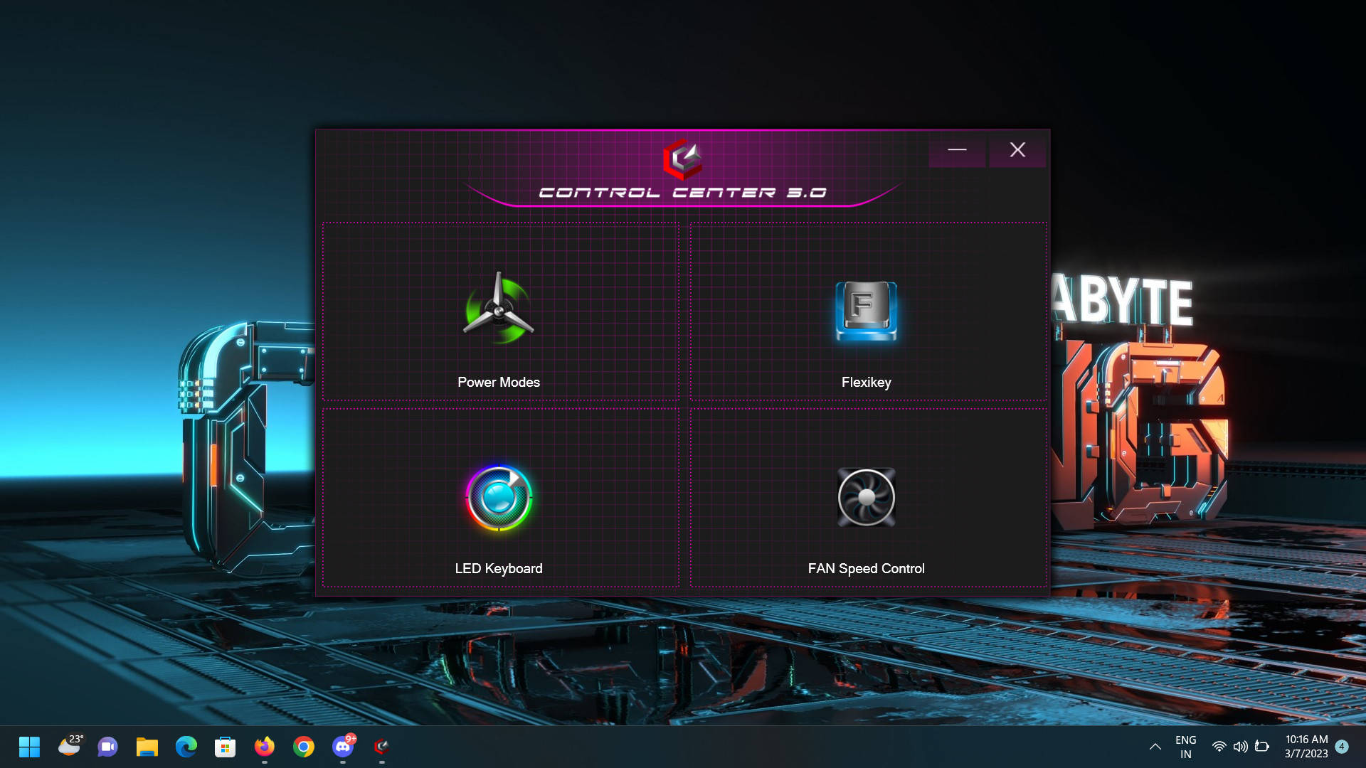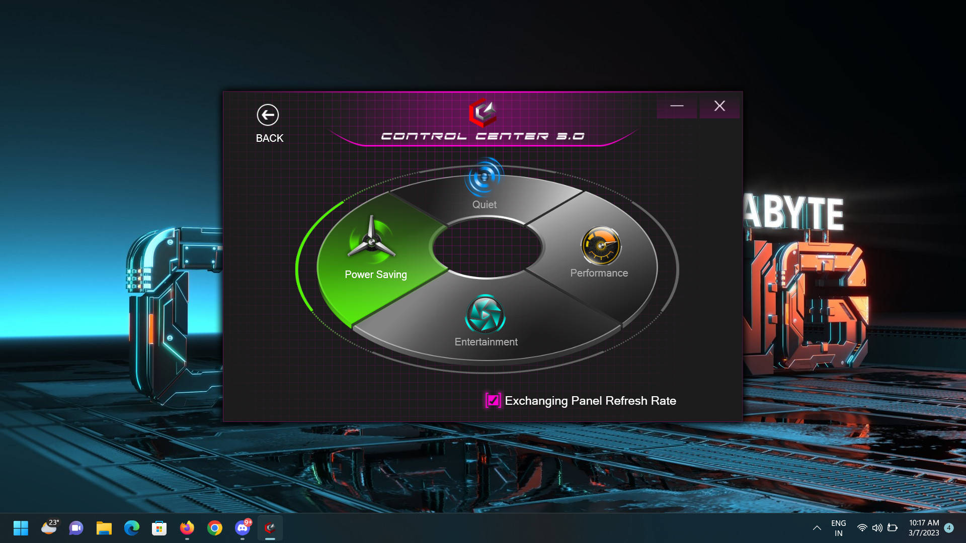 The Gigabyte Control Center 3.0 allows you to switch between performance modes. The app looks rough around the edges with a UI that seems to be from the early 2000s. There are four performance modes – Power Saving, Quiet, Entertainment and Performance. The Power Saving setting also has the option to reduce the refresh rate from 144Hz to 60Hz. Additionally, there are settings to control the fan speeds corresponding to the CPU and GPU temperatures.