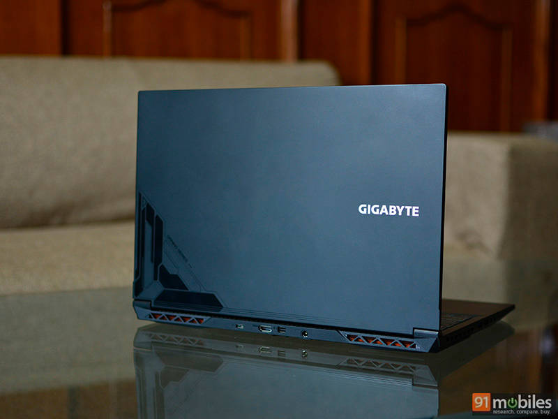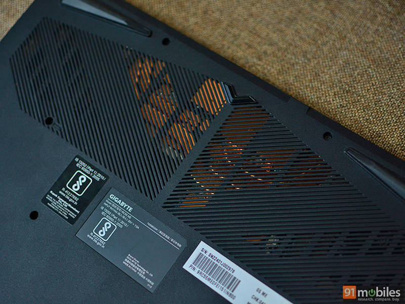 The laptop looks pretty low-key when it comes to the design which doesn’t come as a surprise. There are no flashy red or blue accents, instead, you get an all-black finish with some angular patterns on the bottom corner of the lid and the trackpad. Gigabyte branding can be seen on the lid and underneath the display. The exhaust vents on the rear and sides have neat-looking triangular cutouts, while at the bottom there are additional cutouts for air intake. Clearly, the company is using a lot of copper for the thermal solution as it is visible through these vents.