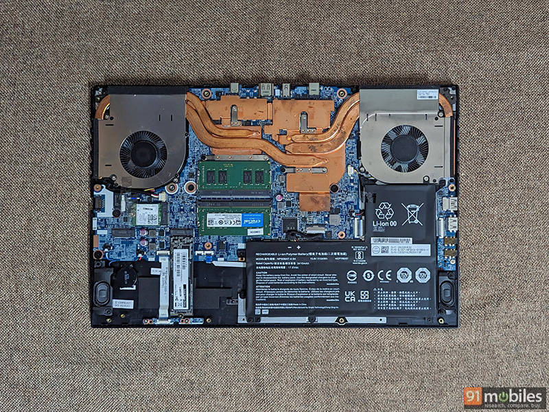 Removing the 13 screws, the bottom cover can be taken off by gently prying it out from the edges. One can swap or replace the two DDR4 memory modules, the M.2 SSD and even the Wi-Fi card. Apart from that you also get access to the 54WHr battery, and the “WINDFORCE cooling solution” that includes two fans with a 59-blade design, five heat pipes and four exhaust vents.