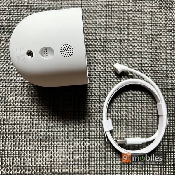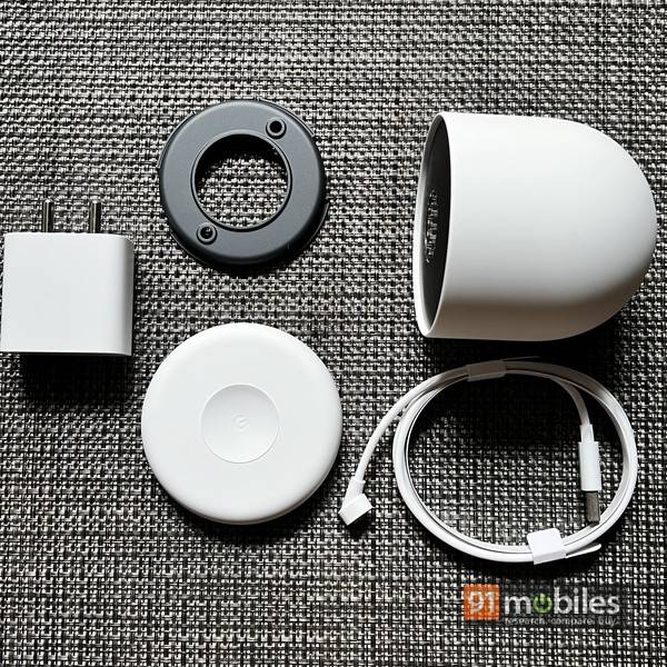 The camera itself is a rather large, oval-shaped device with a flat front where the lens and the sensor are located. You can get the device in any colour, as long as it’s white. There’s an LED on the front that lights up when the camera is recording. The base of the camera has a hole for a screw mount, a cavity where the included charging cable attaches magnetically, and a small speaker. For mounting the camera on the wall, you get a magnetic plate, a wall plate and a pair of screws along with anchors included in the box. The charging cum power cable is 1m long, and can be used along with the bundled 7.5W adapter to supply power to the device. The magnetic plate is quite strong, being able to handle the 400g weight of the camera without issue. And thanks to the rounded shape of the camera, you can position it at any angle on the plate.