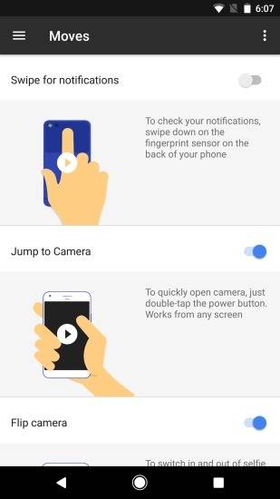 Google has even added support for gestures and motion, and the options for this are available under a heading called Moves in settings. So if you want, you can swipe down on the fingerprint scanner to bring down the notifications panel, double press the power key to launch the camera , and while in the camera app, double twist your wrist to toggle the selfie mode.