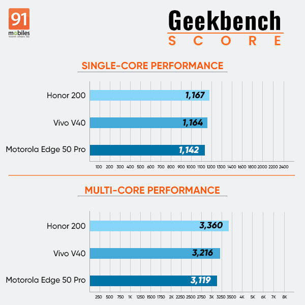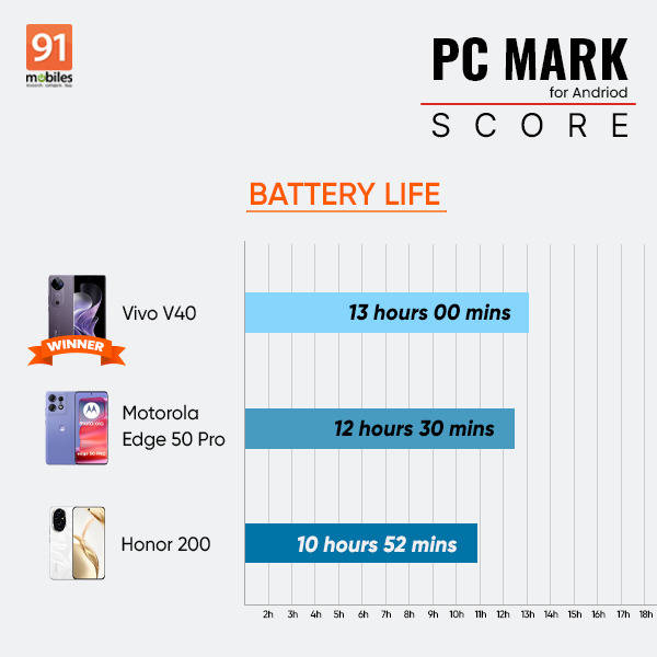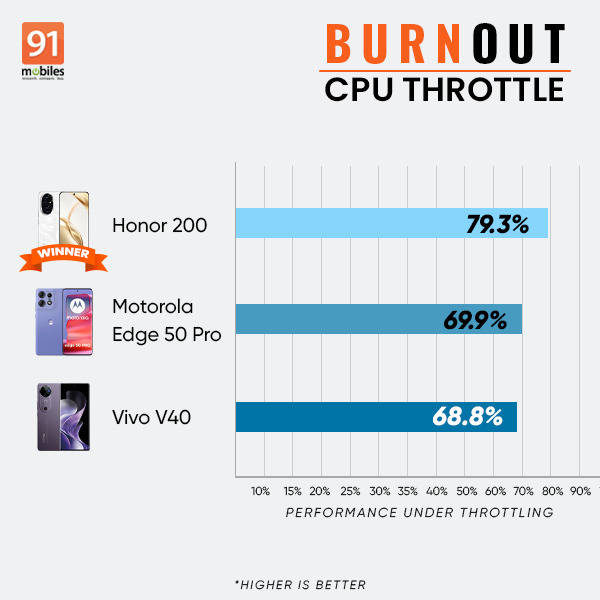Its thermal management could have been better, as both the Motorola Edge 50 Pro and the Vivo V40 have lower average temperatures while gaming. The Honor 200 for instance, shows an average temperature increase of 7.3 degrees Celsius after 30 minutes of gaming. The Motorola Edge 50 Pro registers 5.7 degrees Celsius, and Vivo V40 registers an average temperature increase of just 4 degrees Celsius for the same.