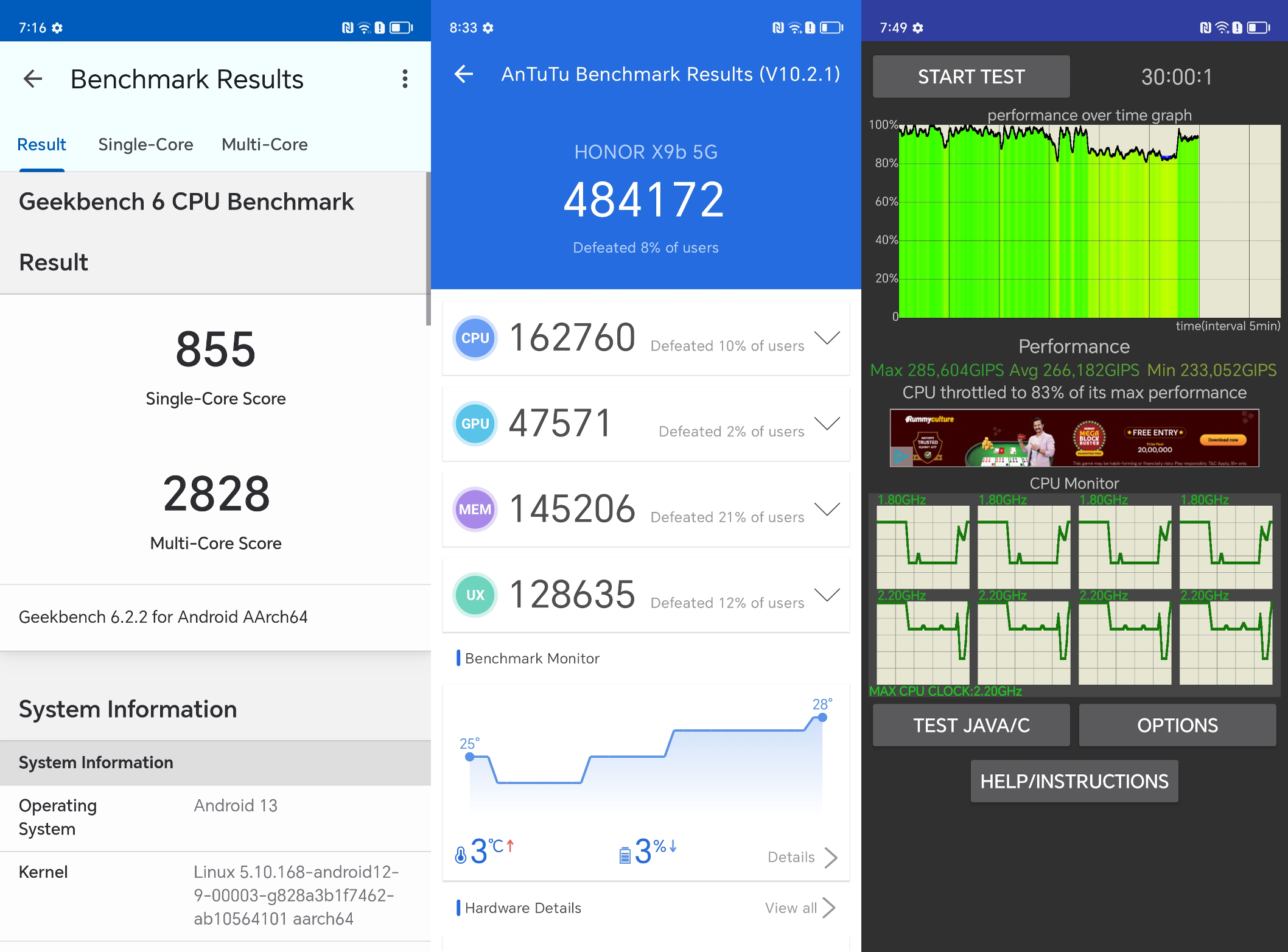 Starting with the benchmark scores, the Honor X9b achieves 4,84,172 points on AnTuTu. On Geekbench, it attained a score of 855 in the single-core test and 2,828 in the multi-core test. Regarding handling intense loads, the handset can perform at 83 percent of its peak performance per the CPU Throttle test. While these scores are marginally lower than those of the Realme 12 Pro, I’m pleased to report the handset performed satisfactorily in real-world usage.