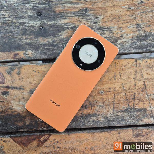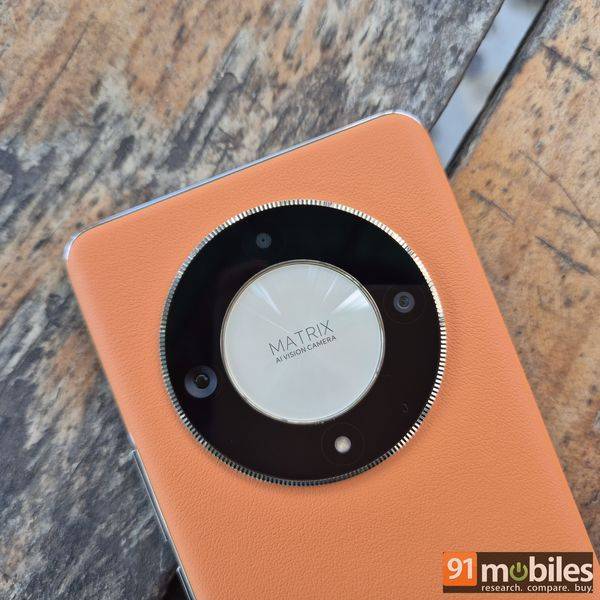 Despite the promised sturdiness, the handset doesn’t compromise on the looks. The Honor X9b exudes premiumness with its ‘luxury’ watch and jewellery-inspired circular camera module and vegan leather back. That said, the vegan leather back is exclusive to the Sunrise Orange colour variant. The phone also comes in a subtle Midnight Black hue, which features a matte finish instead of vegan leather. Nevertheless, the camera module on both variants is surrounded by two golden rings. The outer ring has ridges that enhance the prominence of the camera module, while the inner ring highlights the text ‘Matrix AI Vision Camera’ etched on the smartphone.
