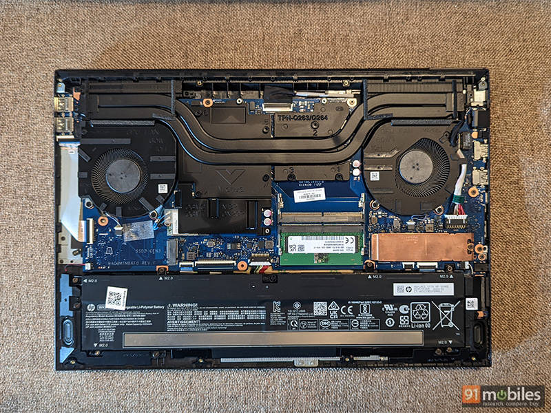 The bottom has a large section for air intake and removing the panel gives access to the internals. On the inside you can see the cooling system which includes two fans and two heat pipes for the CPU and GPU. You also get access to the two memory DIMM slots, one of which was vacant on our unit, essentially allowing you to upgrade in the future. The laptop comes with two M.2 slots for storage and notably, the existing SSD comes with a copper heat-sink on top to keep the temperatures in check. Now that’s definitely a good sign, and HP deserves a pat on the back for this.