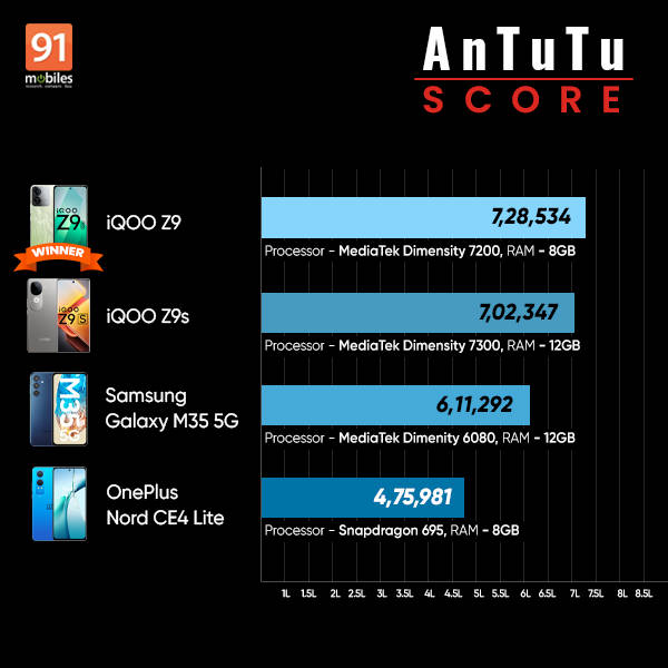 However, the iQOO Z9s excels in performance, surpassing its competitors (excluding the iQOO Z9) and handling most tasks seamlessly. Additionally, its design with a unique pill-shaped camera module, a vibrant AMOLED display, and impressive battery life, set it apart. If these features are important to you, the iQOO Z9s should be worth considering.