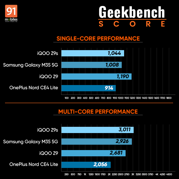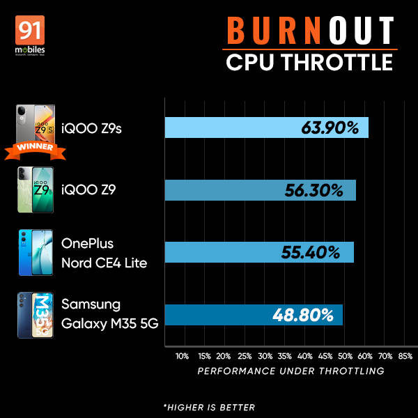 The iQOO Z9s is equipped with the MediaTek Dimensity 7300 chipset. Given the naming convention, one might expect it to outperform the iQOO Z9’s MediaTek Dimensity 7200 SoC. However, this is not the case, and the iQOO Z9s delivered a lower AnTuTu score compared to its predecessor. However, its 7,02,347 score is miles better than most of its competitors, including the OnePlus Nord CE4 Lite and Samsung Galaxy M35 5G. It also performs well on Geekbench, with single-core and multi-core scores of 1,044 and 3,011 respectively. On the Burnout CPU Throttle test, the handset performed at a respectable 63.9 percent of its peak performance.