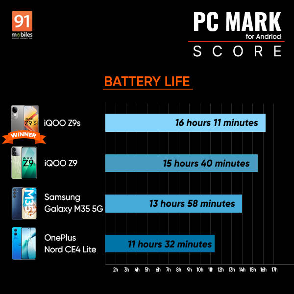 The iQOO Z9s features an upgraded 5,500mAh battery as opposed to 5,000mAh on the regular Z9. This resulted in an enhanced backup in both synthetic benchmarks and our lab tests. The handset recorded 16 hours and 11 minutes on the PCMark battery test, which runs a series of tasks until the battery life drops to 20 percent from 100 percent. This is better than the competitors too.