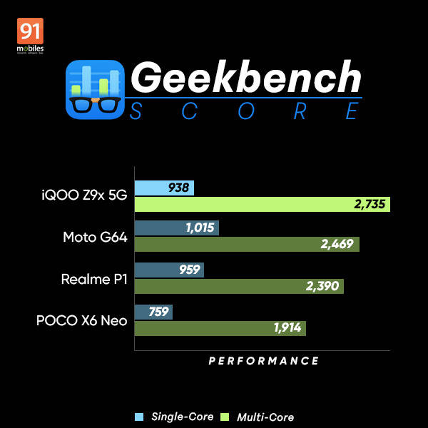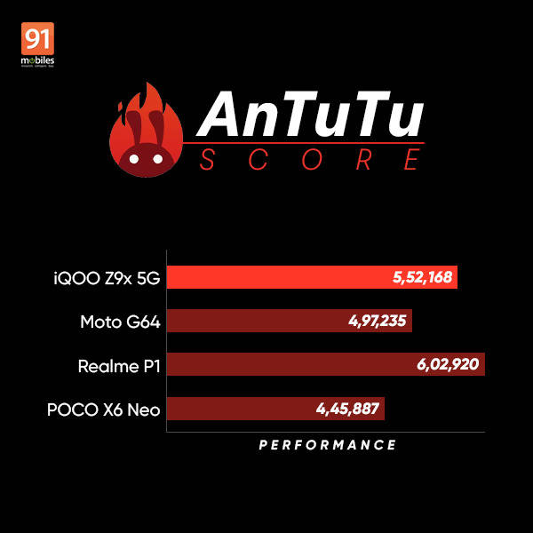 The Snapdragon 6 Gen 1 chipset powers the iQOO Z9x. The device offers up to 8GB of RAM and 128GB of storage. When it comes to performance, the iQOO Z9x smoothly handles all your day-to-day tasks — browsing through social media, video streaming and more. It boasts one of the best AnTuTu and Geekbench benchmark scores in its segment and the gaming performance reflects the same. The device is great for casual gaming and can even handle demanding titles like BGMI and COD: Mobile at High and HD resolutions, respectively.
