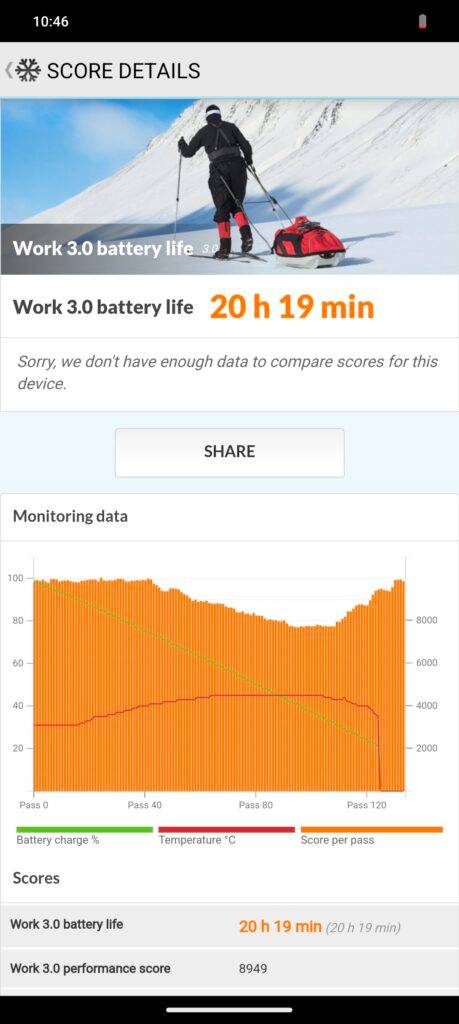 In our performance tests, which last roughly 2 hours and encompass a variety of high-intensity workloads, such as gaming, video streaming, and more, the device showcased a battery drop of just 20 percent, flaunting its excellent resilience. The smartphone’s charging speed is also noteworthy, and it takes about 61 minutes to recharge completely from 20 to 100 percent battery capacity.